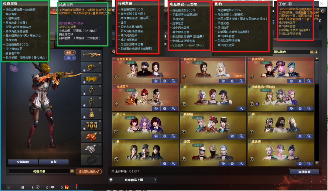 装备描述:排位:可以-------------生化四防极品(生化背包更换、可以查看生化僵尸血量):无需换弹、6烈、3盘、3炼狱+音效、毒蜂、斯泰尔-蝴蝶、死亡之眼、异变清道夫、、双面神、MAC-涂鸦、手斧镜、黄金猫猫手套、3个生化减速雷、超级对讲机、全部弹匣、、、、、爆破四防:幻神3皮(荣耀世冠白鲨、冠军之幻、黄忠+光效)、传说灵眸、王者风神、王者幻神、王者星神、M200-竞技荣光、、、USP雷暴、COP堕天神、COP幻灵、COP雷霆、竞技荣光柯尔特、冠军之特、世冠柯尔特、、王者COP精英刀锋、、、传说圣谕、FAMAS G2-天戎、传说夜影、传说圣灵、QBZ金色蔷薇、王者芳薇、王者白虎、白虎之魄、、、、、7套雷霆、7套雷暴、5套堕天神、7套夜魔、2套幻灵、、、、生化四防(神威莲华、传说星骇、暗夜审判)、爆破四防(传说女帝、云悠悠、凌霄、司雨、王者潘多拉、王者春、影豹、鹰、月兔特工)