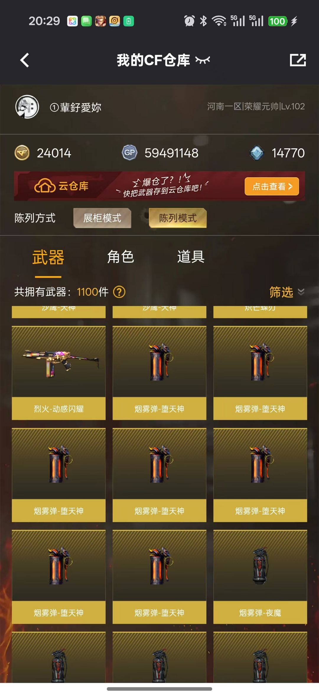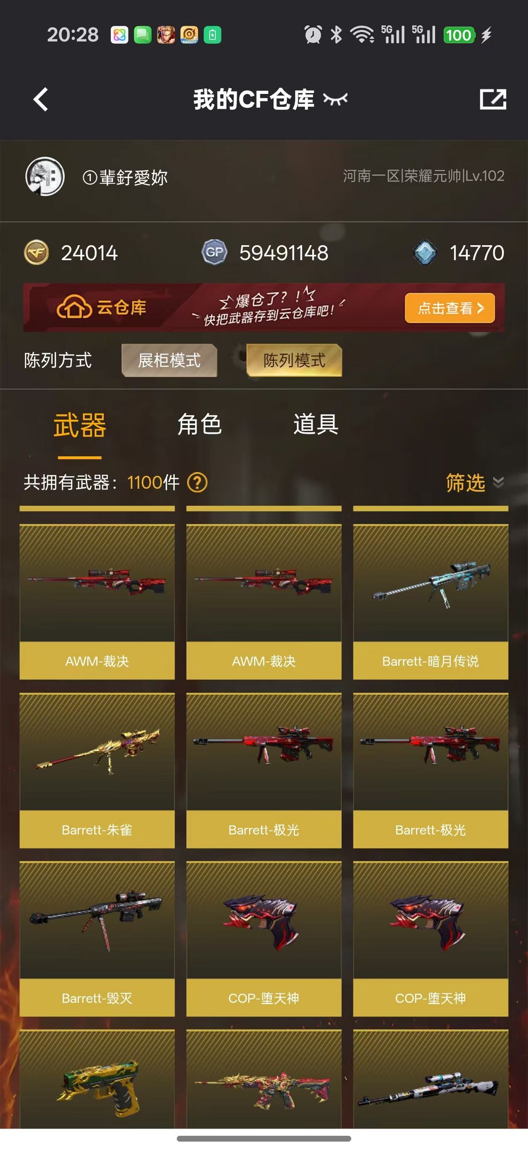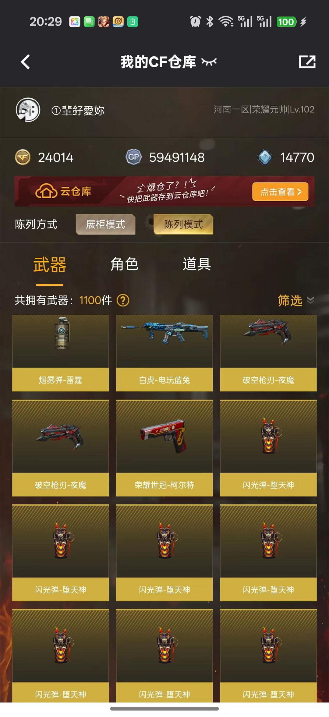 装备描述:王者武器:王者之幻-觉醒版;王者星神-觉醒版;炼狱-悦蓝-觉醒版;王者之锋-觉醒版;王者之影-觉醒版;王者之心-觉醒版;炫金雷神 英雄武器:机械迷城-穹宇;炽芒蝶刃;M200-竞技荣光;烟雾弹-竞技荣光;黑武士-锦绣游龙;黑骑士-海王;龙啸-烈火龙威;烈火-动感闪耀;屠龙-动感闪耀;天神-动感闪耀;手雷-动感闪耀;无影-神兵利器;AK47-火麒麟;AK-47-猩红传说;白虎-电玩蓝兔;传说辉光;AWM-天龙;Scar Light-白虎;柯尔特-竞技荣光;高爆手雷-竞技荣光;擎天-竞技荣光;闪光弹-竞技荣光;破空枪刃-夜魔;M4A1-夜魔;烟雾弹-夜魔;高爆手雷-夜魔;闪光弹-夜魔;马来剑-夜魔;荣耀世冠-柯尔特;RPK-盘龙;Kar98K-星神;AWM-裁决;沙鹰-修罗;HK417-朱雀;汤姆逊-烈龙;M4A1-雷神;加特林-炼狱;COP-堕天神;烟雾弹-堕天神;高爆手雷-堕天神;闪光弹-堕天神;M4A1-堕天神;麒麟刺-堕天神;龙啸-堕天神;AK47-无影;AK47-B-战士;Barrett-朱雀;AK12-天启;AA-12-雷霆;USP-雷暴;高爆手雷-雷暴;烟雾弹-雷暴;闪光弹-