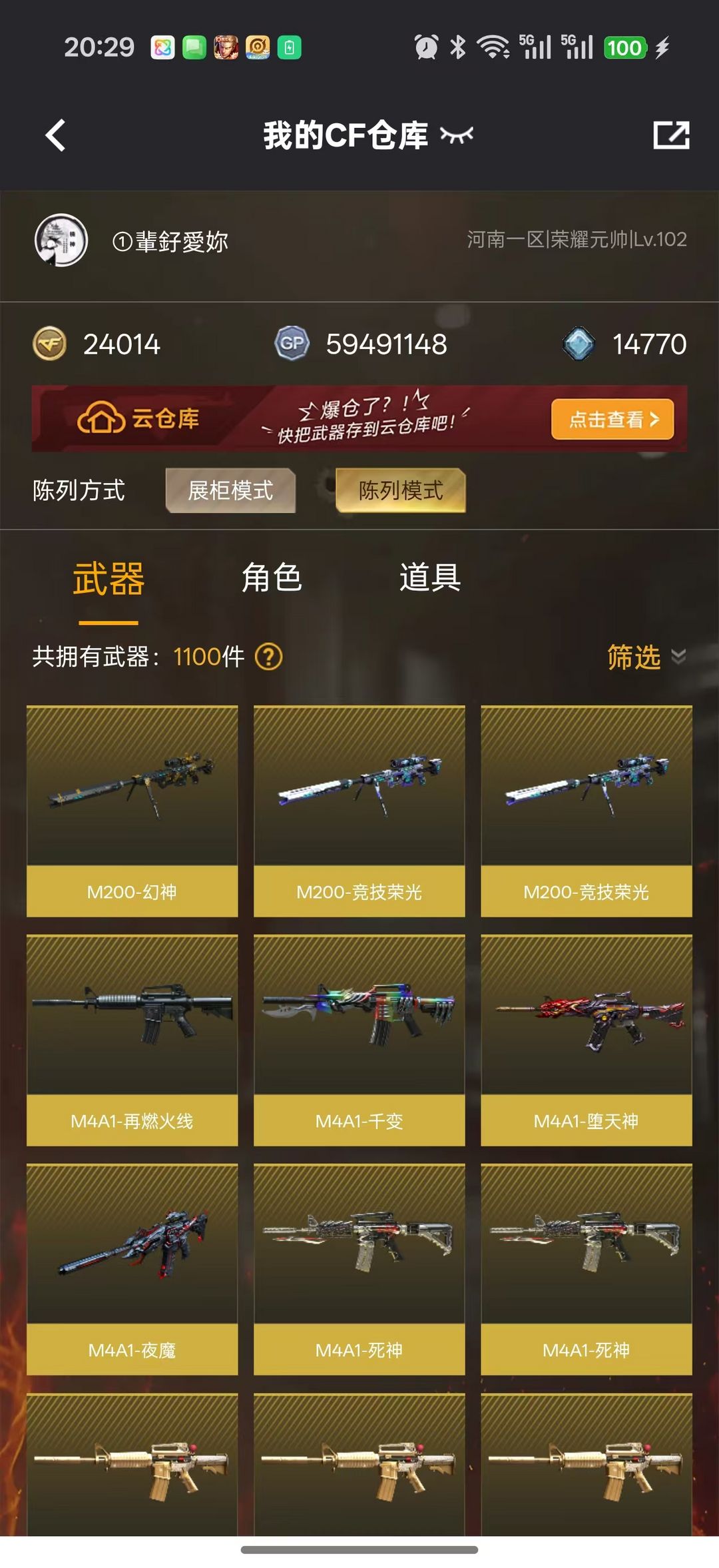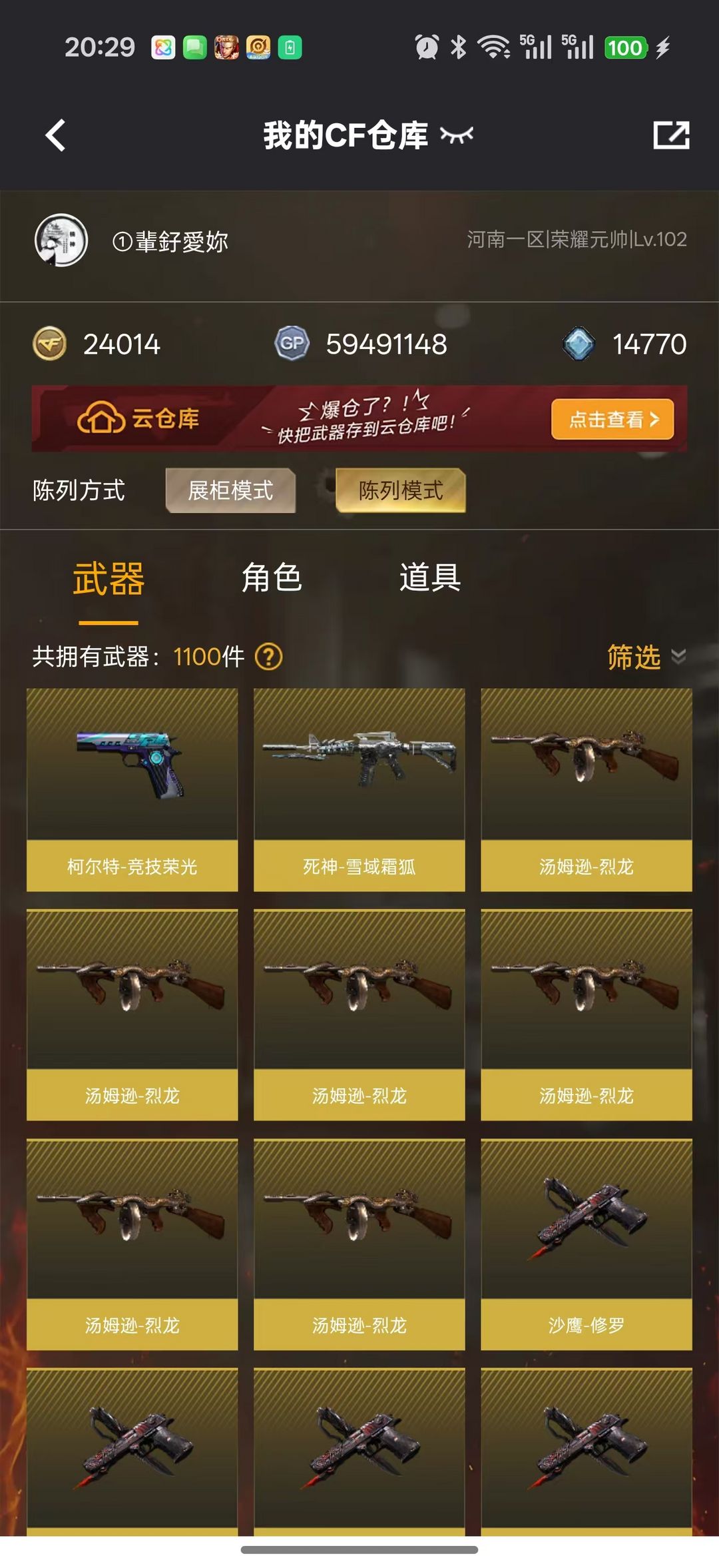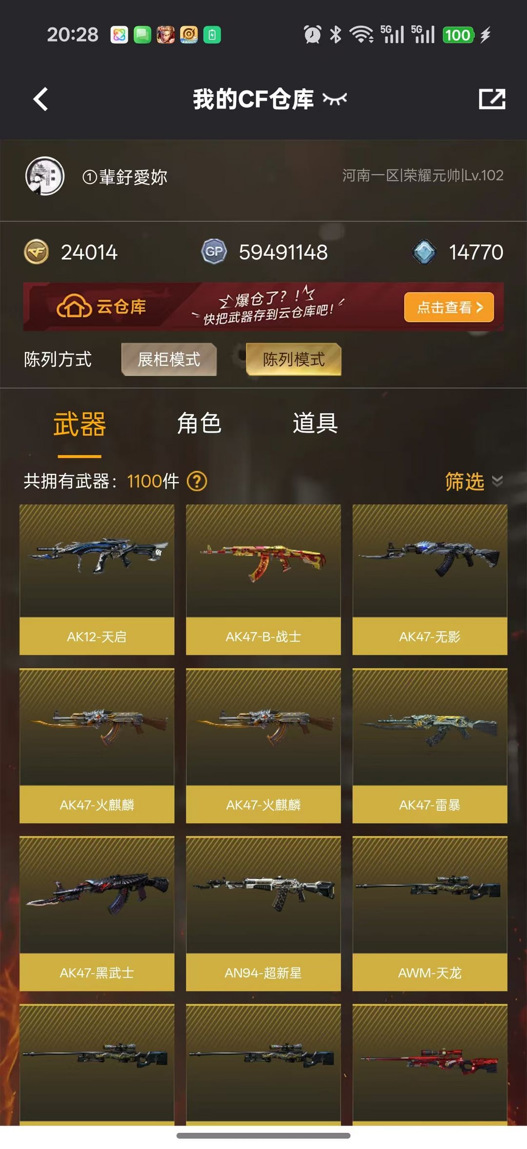 装备描述:王者武器:王者之幻-觉醒版;王者星神-觉醒版;炼狱-悦蓝-觉醒版;王者之锋-觉醒版;王者之影-觉醒版;王者之心-觉醒版;炫金雷神 英雄武器:机械迷城-穹宇;炽芒蝶刃;M200-竞技荣光;烟雾弹-竞技荣光;黑武士-锦绣游龙;黑骑士-海王;龙啸-烈火龙威;烈火-动感闪耀;屠龙-动感闪耀;天神-动感闪耀;手雷-动感闪耀;无影-神兵利器;AK47-火麒麟;AK-47-猩红传说;白虎-电玩蓝兔;传说辉光;AWM-天龙;Scar Light-白虎;柯尔特-竞技荣光;高爆手雷-竞技荣光;擎天-竞技荣光;闪光弹-竞技荣光;破空枪刃-夜魔;M4A1-夜魔;烟雾弹-夜魔;高爆手雷-夜魔;闪光弹-夜魔;马来剑-夜魔;荣耀世冠-柯尔特;RPK-盘龙;Kar98K-星神;AWM-裁决;沙鹰-修罗;HK417-朱雀;汤姆逊-烈龙;M4A1-雷神;加特林-炼狱;COP-堕天神;烟雾弹-堕天神;高爆手雷-堕天神;闪光弹-堕天神;M4A1-堕天神;麒麟刺-堕天神;龙啸-堕天神;AK47-无影;AK47-B-战士;Barrett-朱雀;AK12-天启;AA-12-雷霆;USP-雷暴;高爆手雷-雷暴;烟雾弹-雷暴;闪光弹-