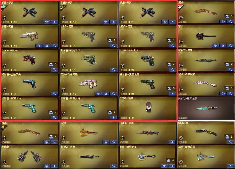 装备描述:可以排位 恶意撤单永久拉黑 传说破晓影煞♥艾莉莎♥传说暗裔♥夜影♥星霆♥云龙套♥冠军之星虎♥臻藏版雷神♥N9♥宠儿幻神♥巅峰荣耀套♥王者幻神 修罗5把 天神2把 USP雷暴2把 COP堕天神1把 破空枪刃夜魔1把 柯尔特竞技荣光2把 USP神功天巧2把 COP云龙1把 冠军之特3把 荣耀世冠柯尔特1把 龙啸 屠龙 擎天 麒麟刺 马来剑夜魔 斩神刀雷暴 云龙扇 炽芒蝶刃3把 王者玉峰3把 雷神皮肤 臻藏 荣耀 星空 虎将 耀金 白鲨 宠儿 (音效卡) 幻神皮肤 N9 宠儿 巅峰荣耀 (音效卡) 皇龙戒 御龙戒 (全是1秒连杀时间) 毁灭皮肤 星空 AG 冠军 直播 (音效卡) 火麒麟皮肤 AG 冠军心♥轻羽 心动糖果 黑骑士皮肤 冠军 地狱火 朋克