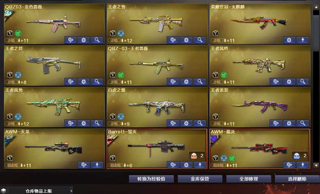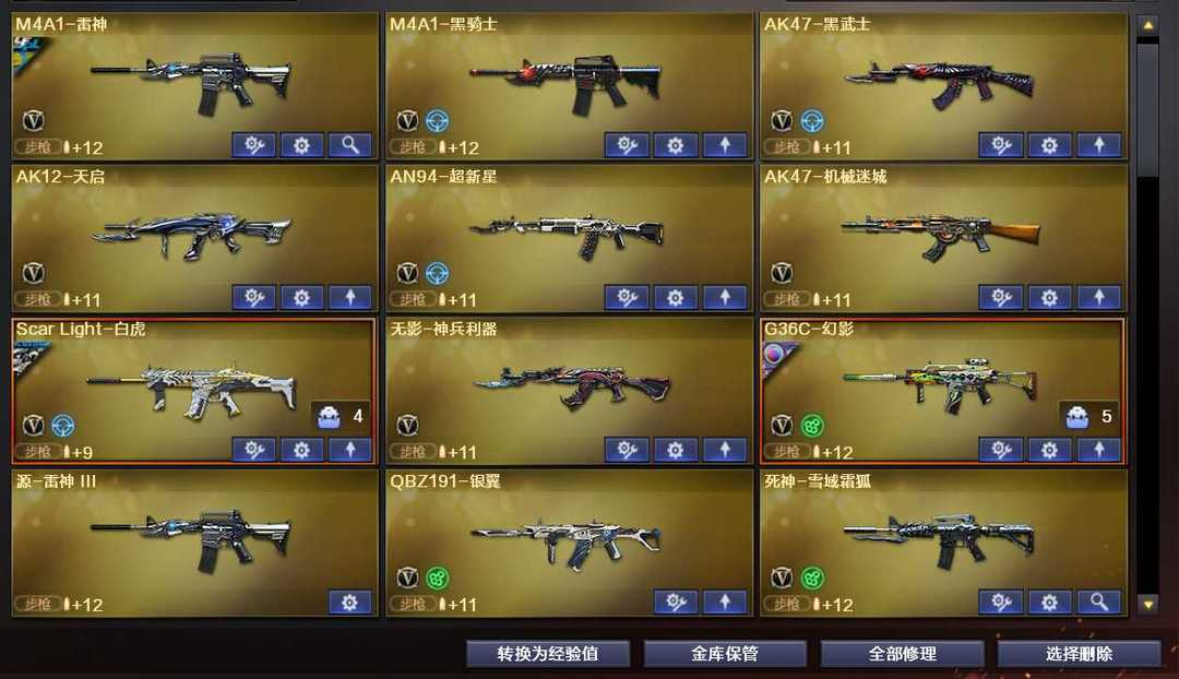 装备描述:幻神,传说幽瞳x3,,传说辉煌,传说幽冥x2,冠军之特,冠军之刃,usp雷暴 cop两把,艾丽莎,隼, G36C-幻影,星神,量子之心,浓烟全满,满副武器,炽芒蝶刃三把,qbz,白虎,加利尔,银翼,马枪,金色小号,步枪全满,幻神音效卡,裁决音效卡,星神音效卡,白虎音效卡,G36音效卡,qbz音效卡,