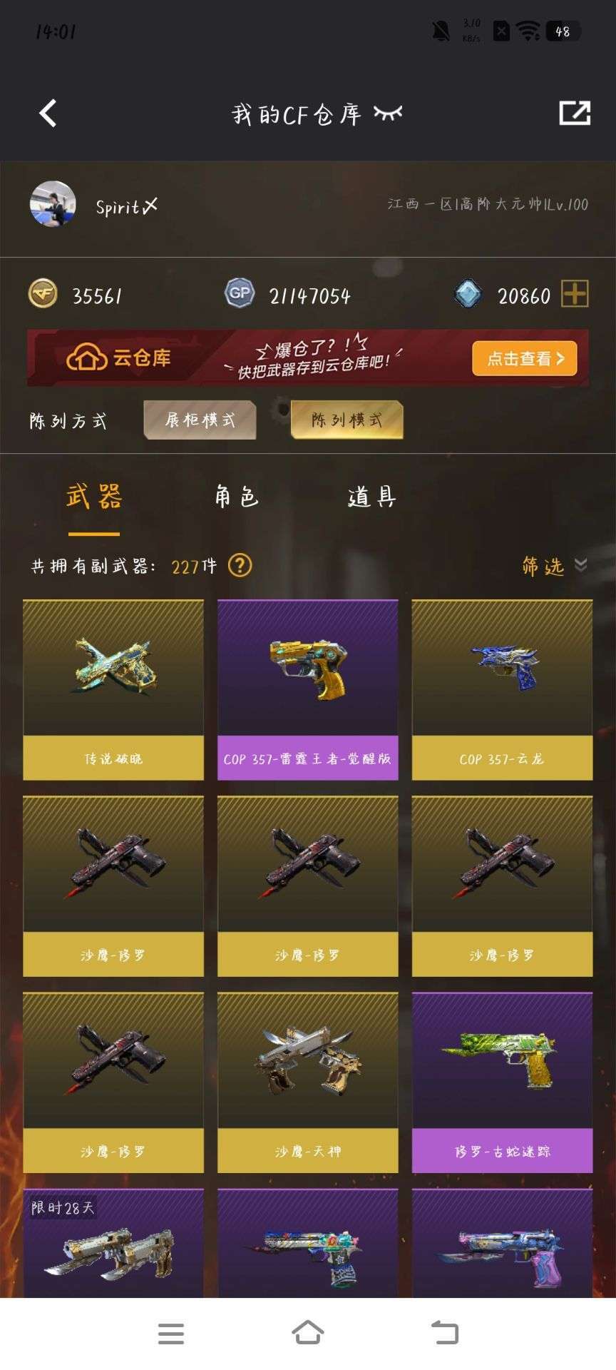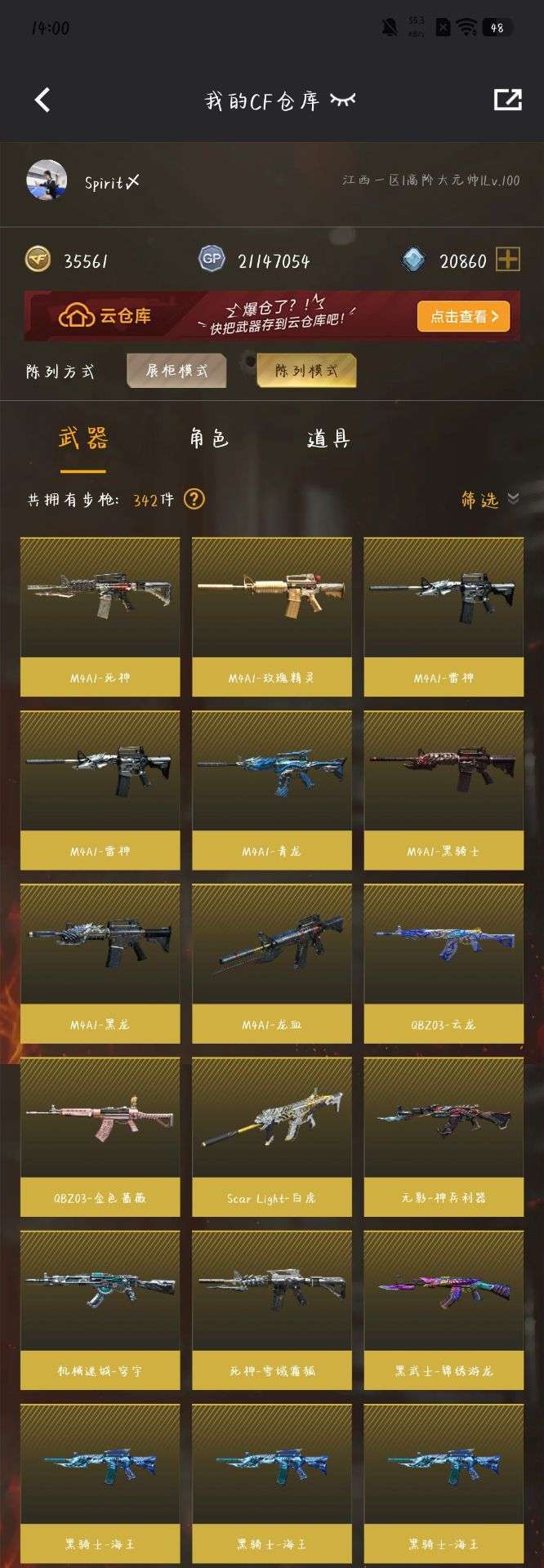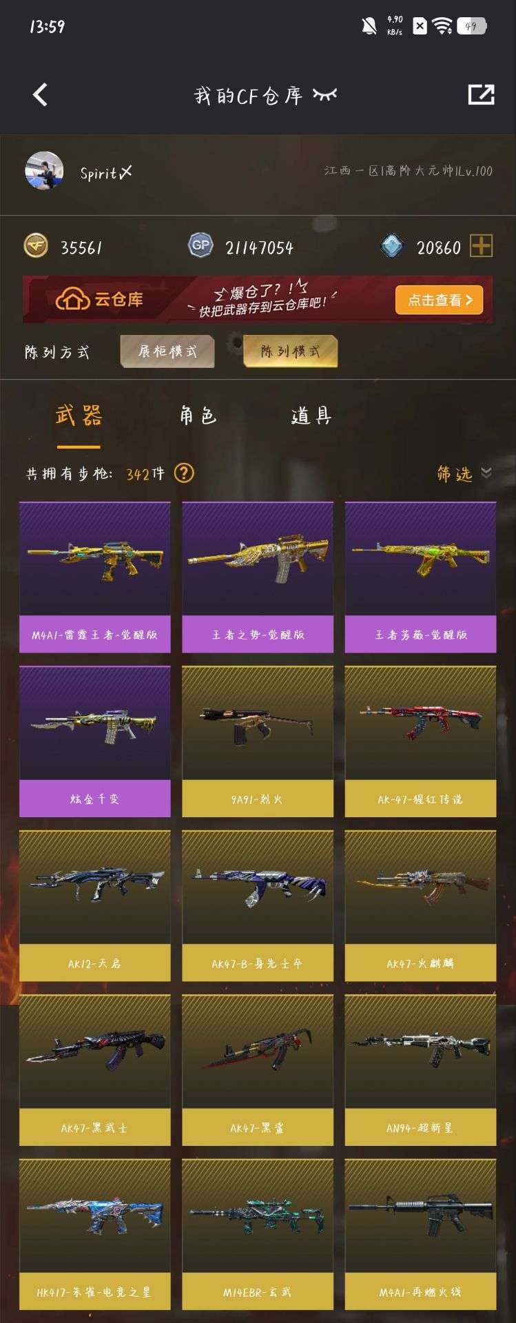 装备描述:星神,星神音效卡,幻神,白虎,白虎音效卡,隼,英雄级cop,传说沙鹰,金色蔷薇,鹰,马枪,各种小人枪,几乎所有的热门武器都有,可排位,vip满级,生化爆破极品号,不要错过哦!