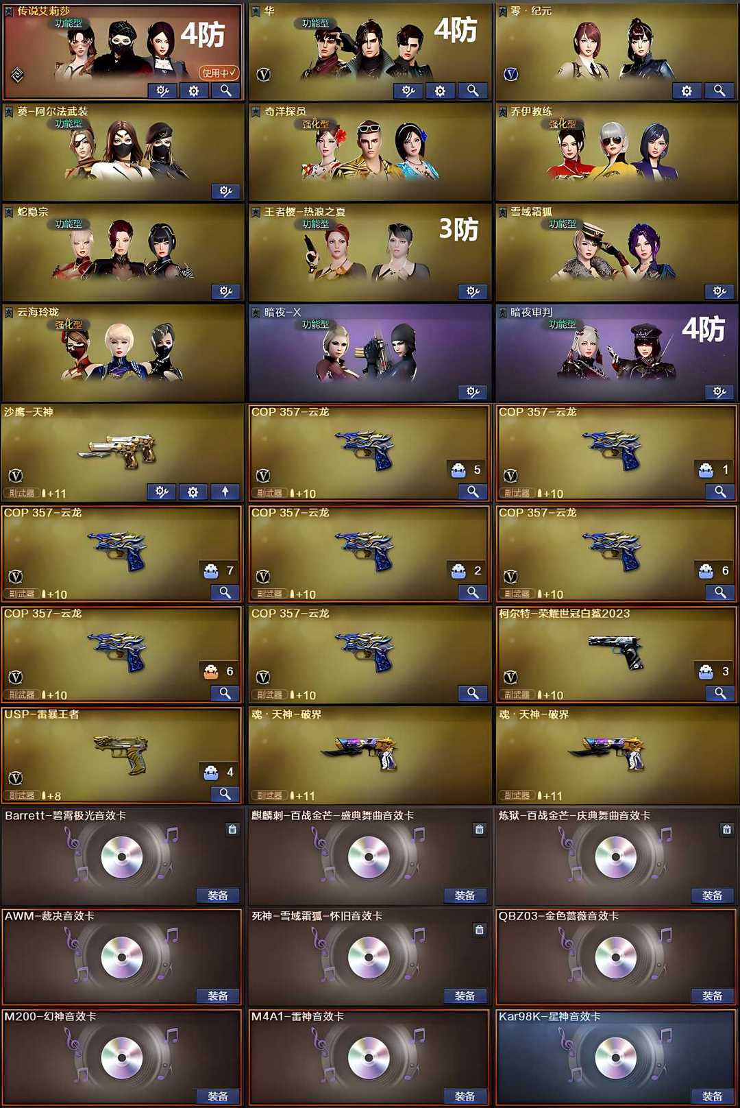 限制: 租号5次及以上 |装备描述:角色:4防传说艾丽莎 4防华 4防暗夜审判 主武器:幻神 星神 裁决 法玛斯 G36C 白虎 qbz 雷神 副武器:7云龙COP 1王者usp 1白鲨柯尔特 近战武器:2蝴蝶刀 音效卡:幻神 裁决 星神 qbz 雷神 皮肤 幻神女团 qbz女团 毁灭枪娘 裁决流光秘银 雷神n9