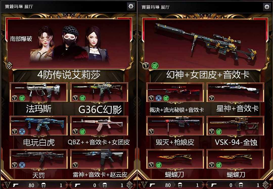 4防传说艾丽莎⚡7云龙COP⚡幻神星神裁决三件套⚡法玛斯⚡C36C幻影⚡白虎qbz⚡2蝴蝶刀⚡女团⚡