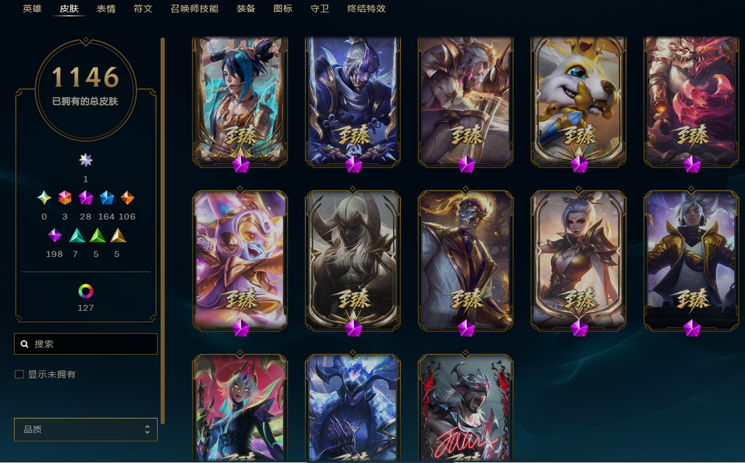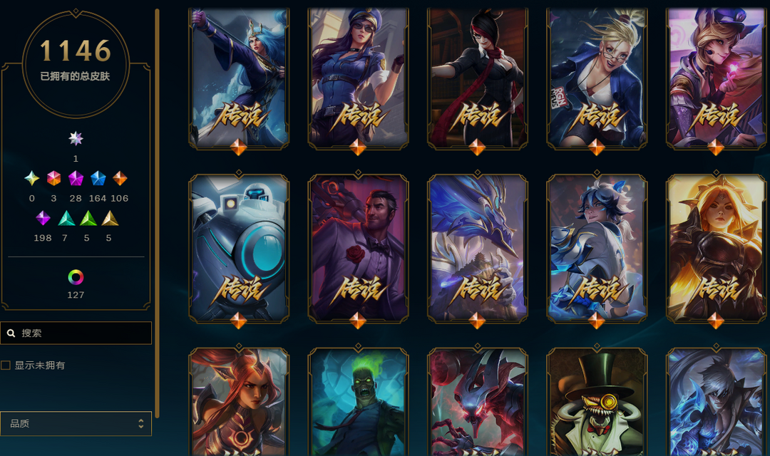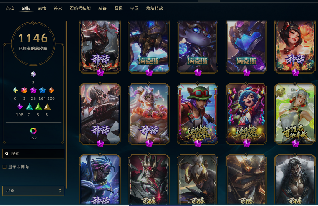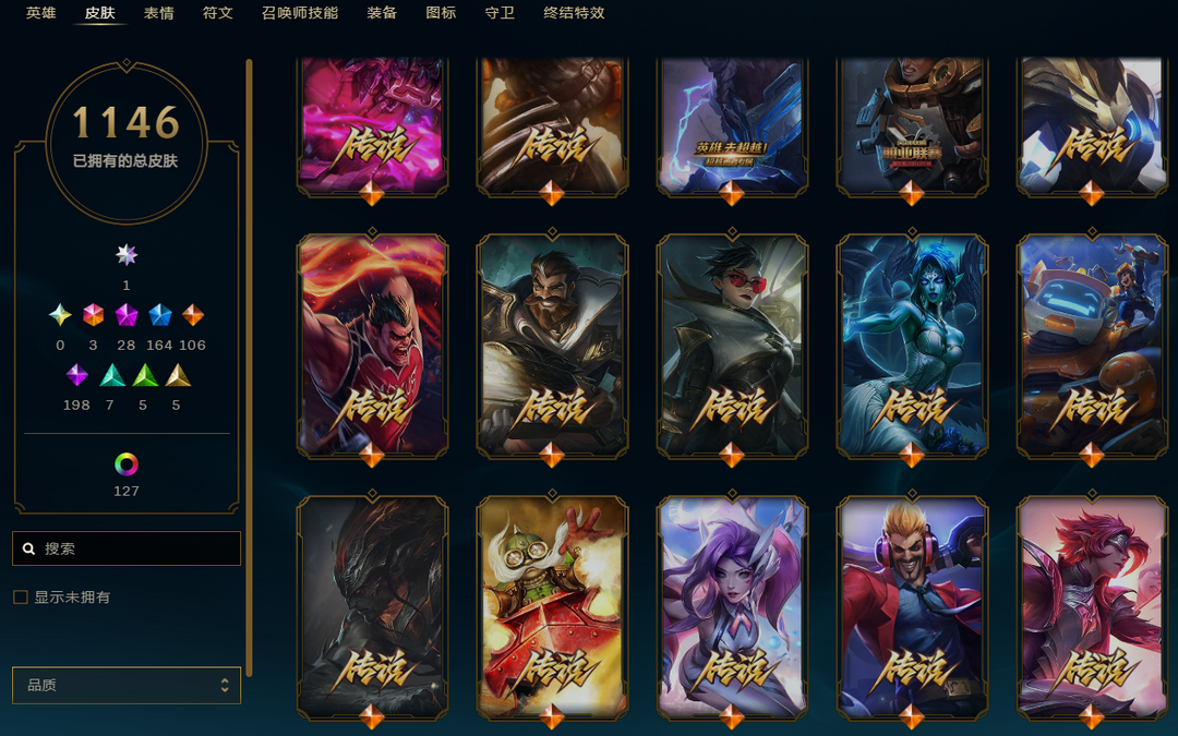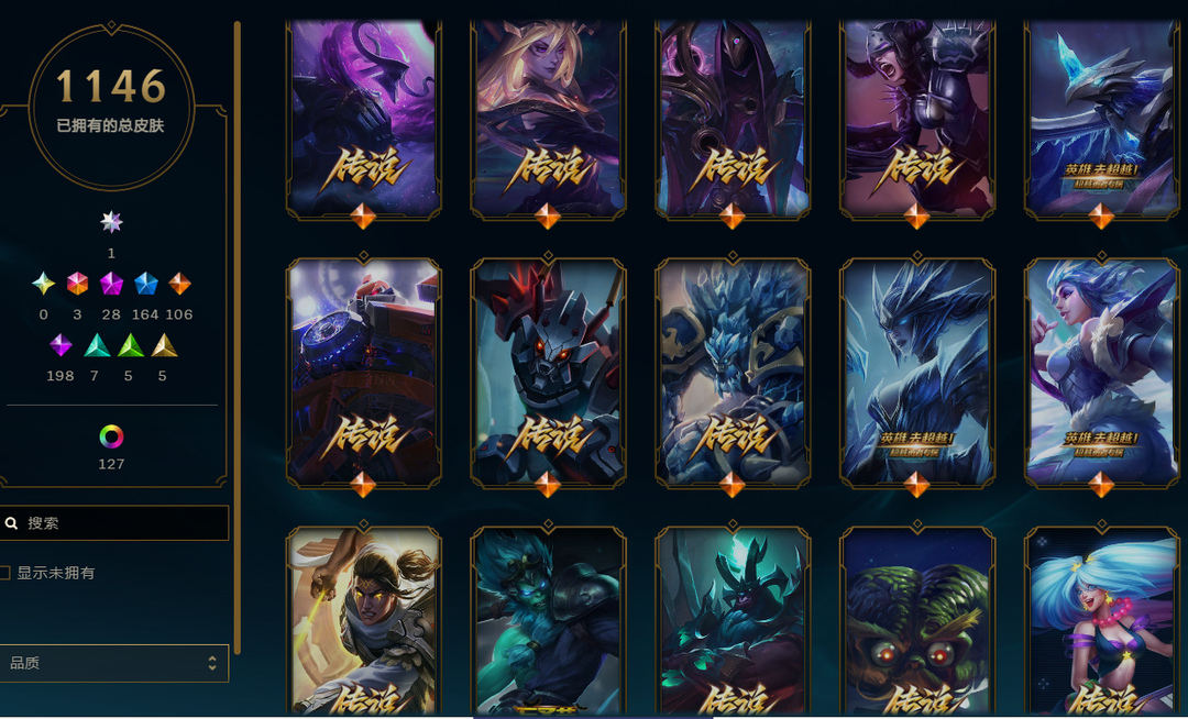 卓越1 终极3 神话28 传说106 限定164 皮肤数量1146