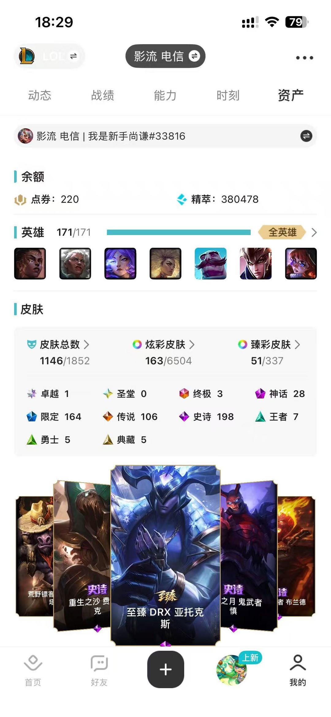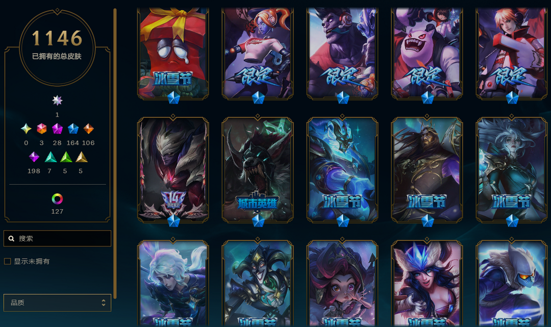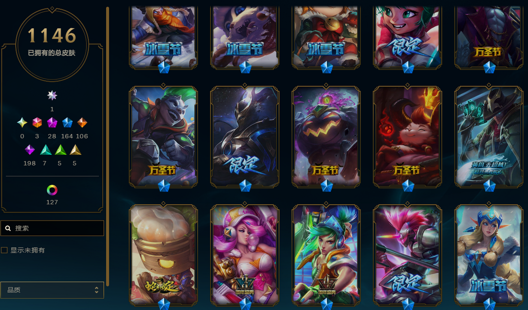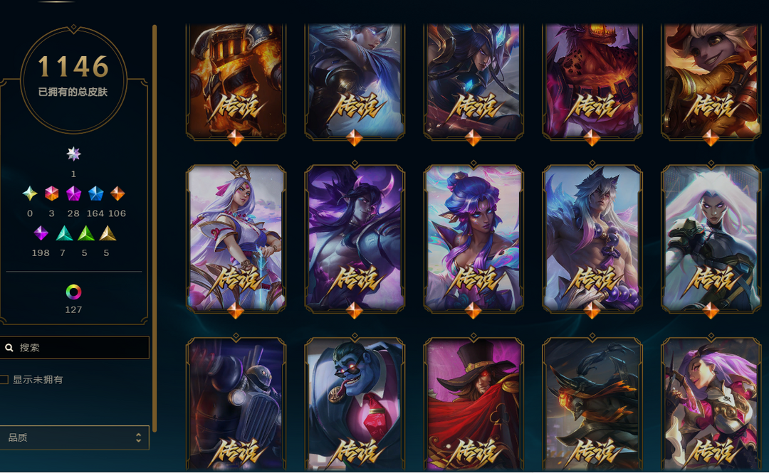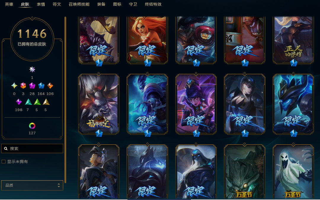 卓越1 终极3 神话28 传说106 限定164 皮肤数量1146
