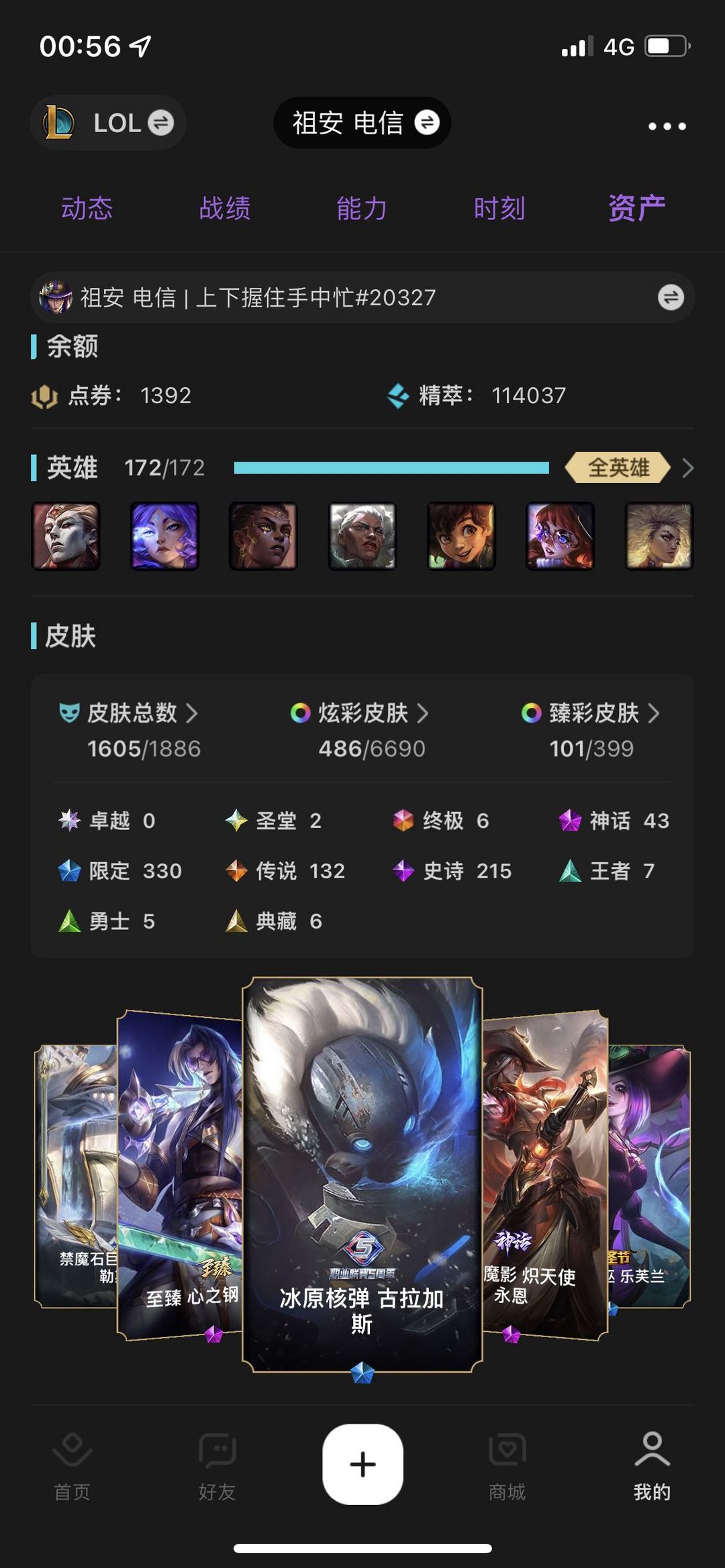 装备描述:各种限定传说皮肤,高质量账号,限定有猪妹奥斯曼蛮王冰桶,出现异常多登陆几次即可 喜欢记得收藏哦 可以排位匹配云顶海斗大乱斗随便打 段位等于零 不要挂机逃跑故意送人头 如果导致封号直接起诉 谢谢合作~