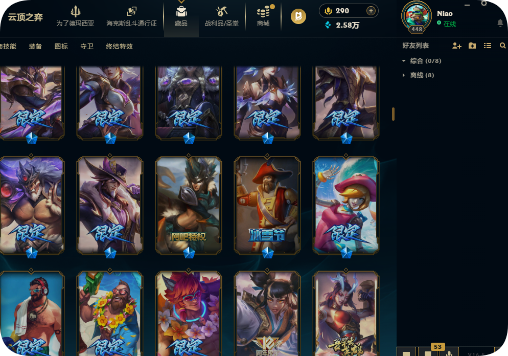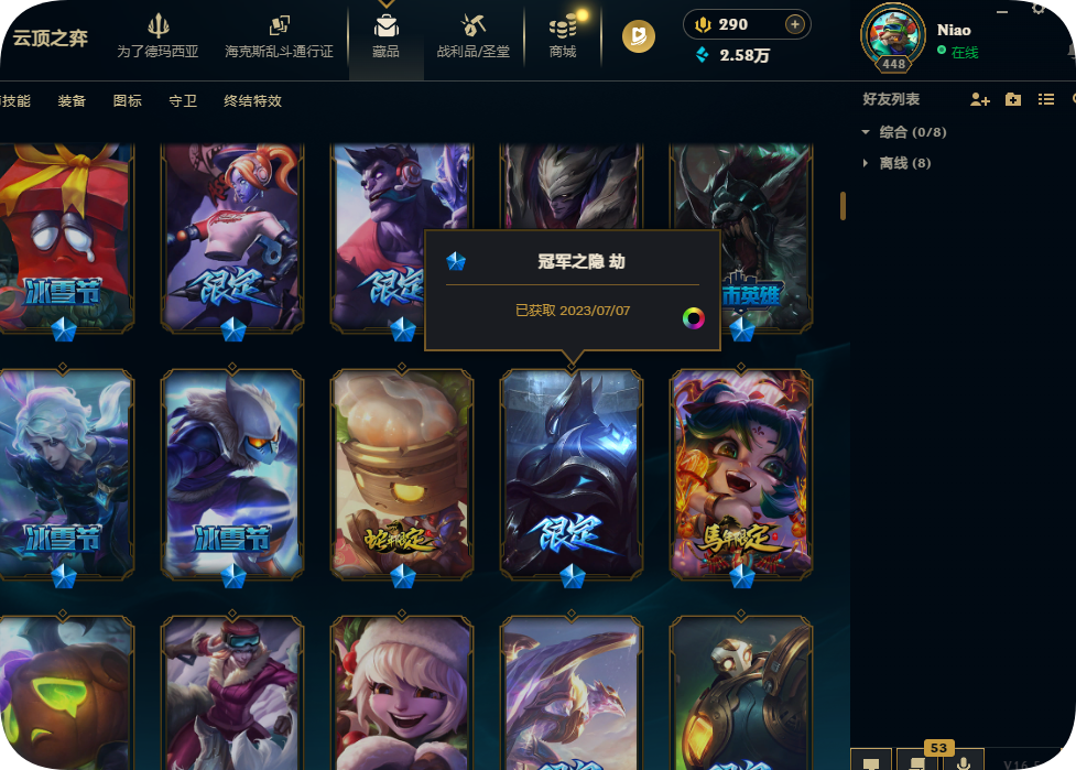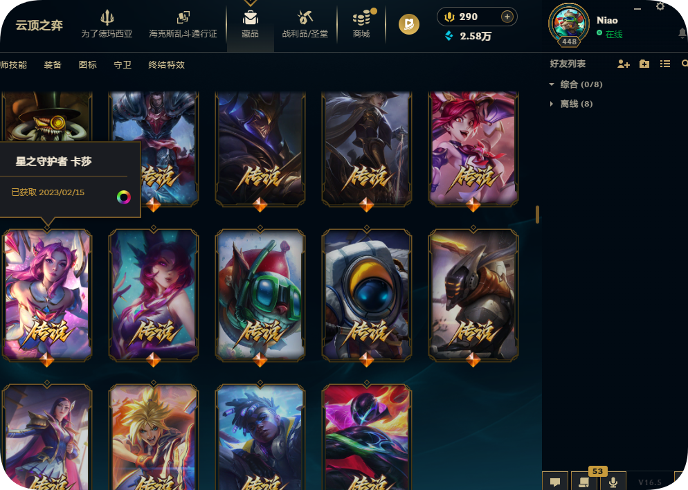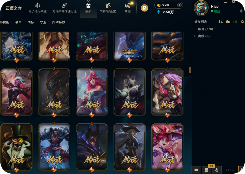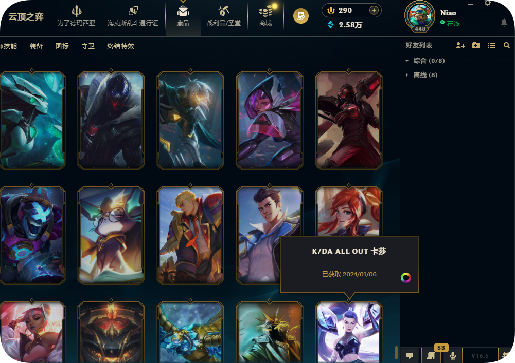 800皮肤全英雄铂金可排位殿堂传奇妖姬冠军劫龙马烈焰波比SKT劫瑞兹黑夜亚索星守KDA卡莎未来战士套