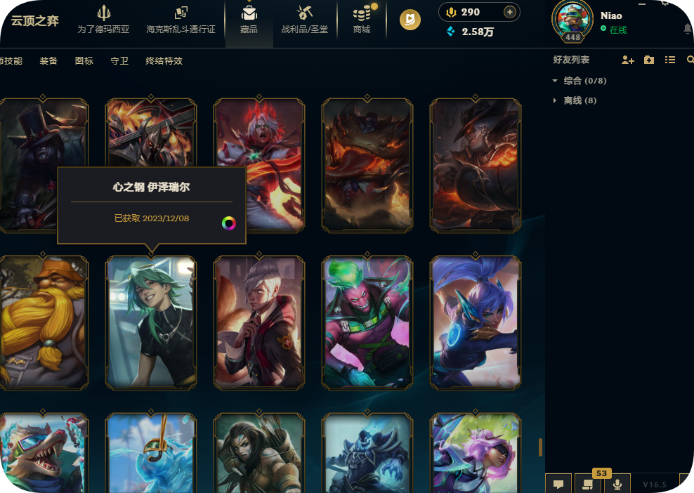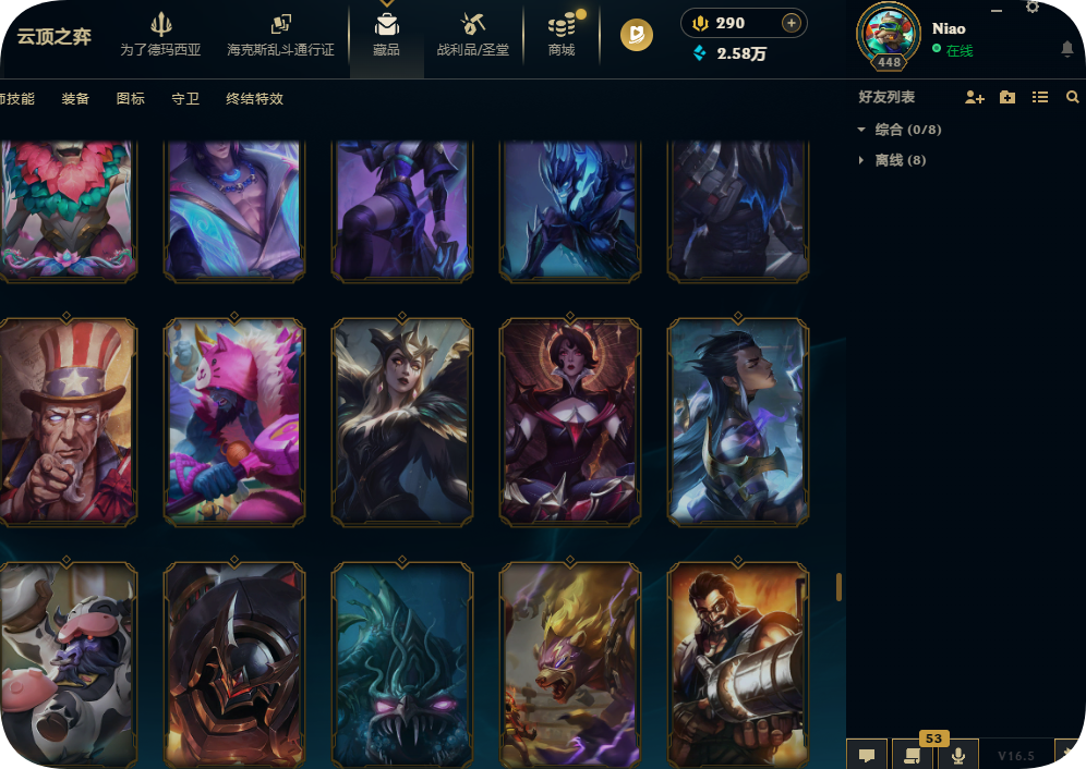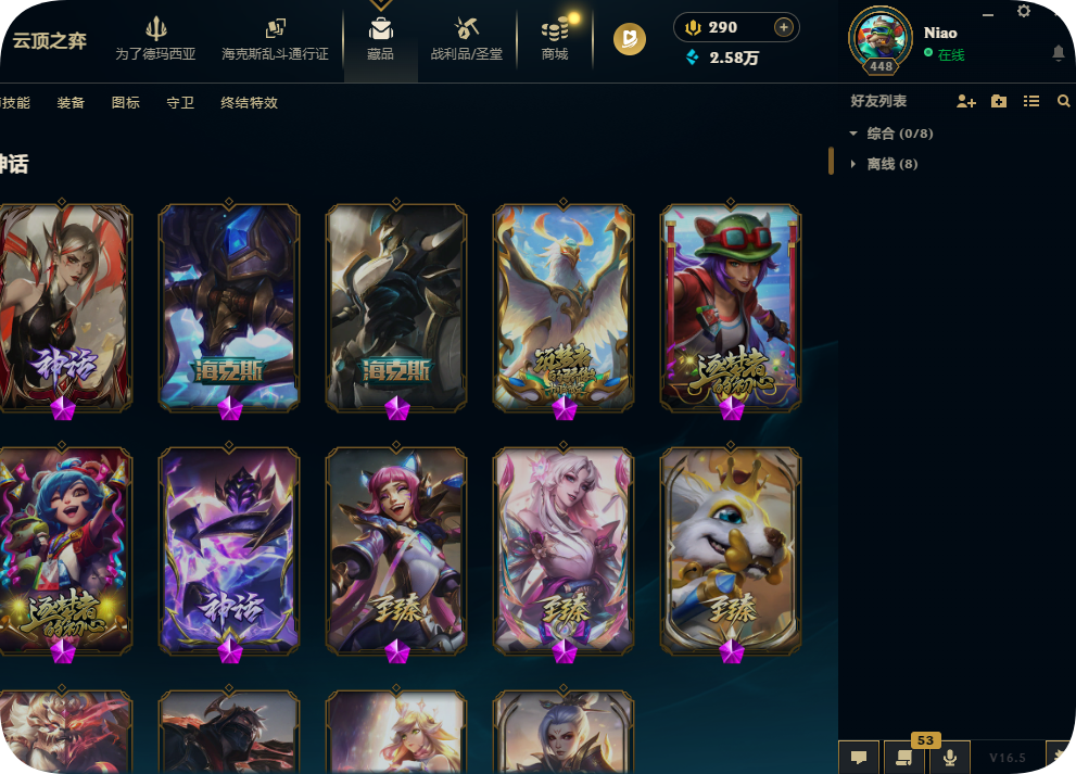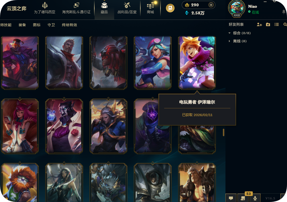 800皮肤全英雄铂金可排位殿堂传奇妖姬冠军劫龙马烈焰波比SKT劫瑞兹黑夜亚索星守KDA卡莎未来战士套