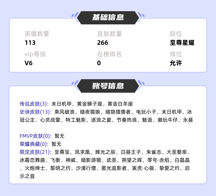 限制: 租号5次及以上 |装备描述:皮肤比我多的比我更花钱 没我花钱的皮肤没我多,优质账号全天出租 欢迎收藏随时租用 键位不习惯请自行调整 感谢各位租过此号的租户,路过的各位也可点个收藏欢迎哪天来 祝各位天天开心天天发财,每次租号都有一个开心的体验过程