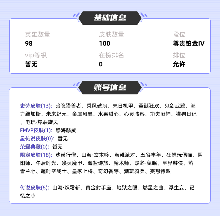 具体看图软件信息不全浮生妄*电玩高手*黄金射手座*燃星之曲*记忆之芯*9传说*42史诗*可排位
