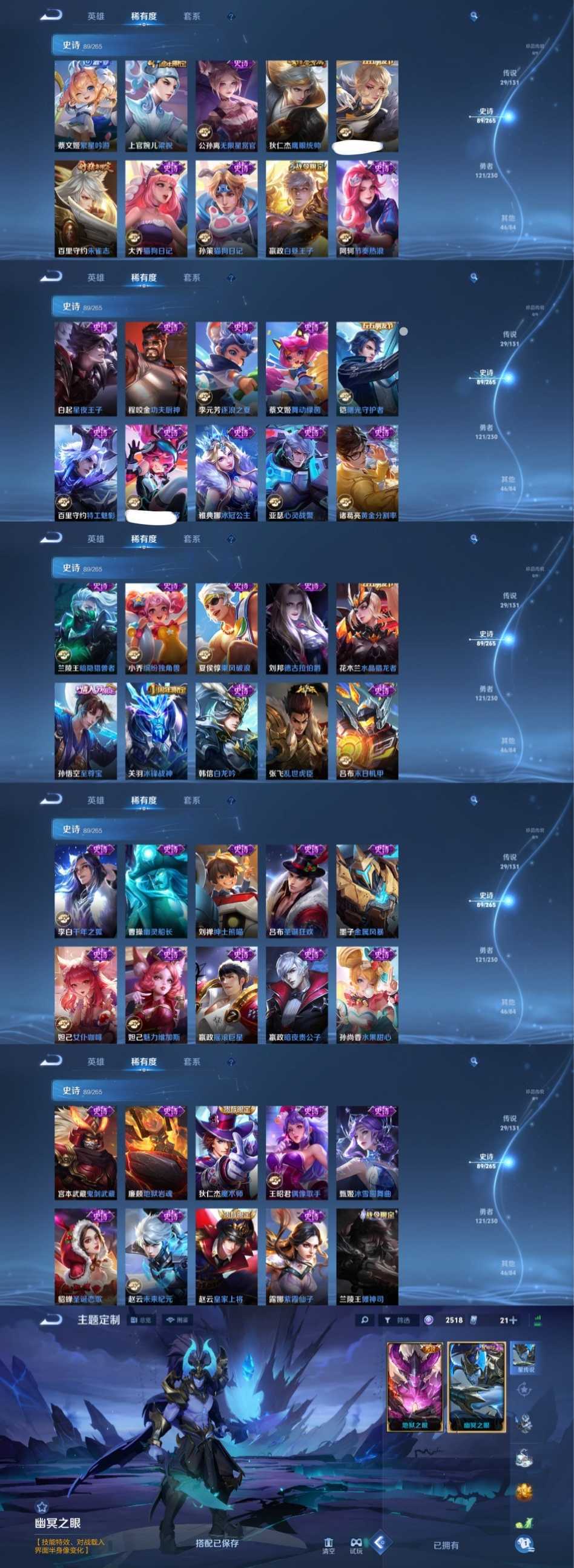 限制: 租号1次及以上 | 撤单率<49%才可租用此帐号装备描述:时间到了还登录白玩或者顶号全部改密拉黑处理永不解除,顶号机器会秒禁玩改密,顶号不仅拉黑还没得玩,赚三两块不容易,请理解谢谢。 ❤❤❤❤❤❤❤❤❤❤❤❤❤❤❤❤❤❤❤ 请勿开挂,挂机,送头,骂人,撤单后游戏等如有违规永久拉黑永不解除。 重置二级密码不要费劲了,号主每天都会上号查看,多行不义必自毙,人在做天在看,多做好事多自律,少做缺德事。 该号英雄127个皮肤314个,典藏1个,无双1个,星传说1个,传说33个,史诗95个,祝您游戏愉快~
