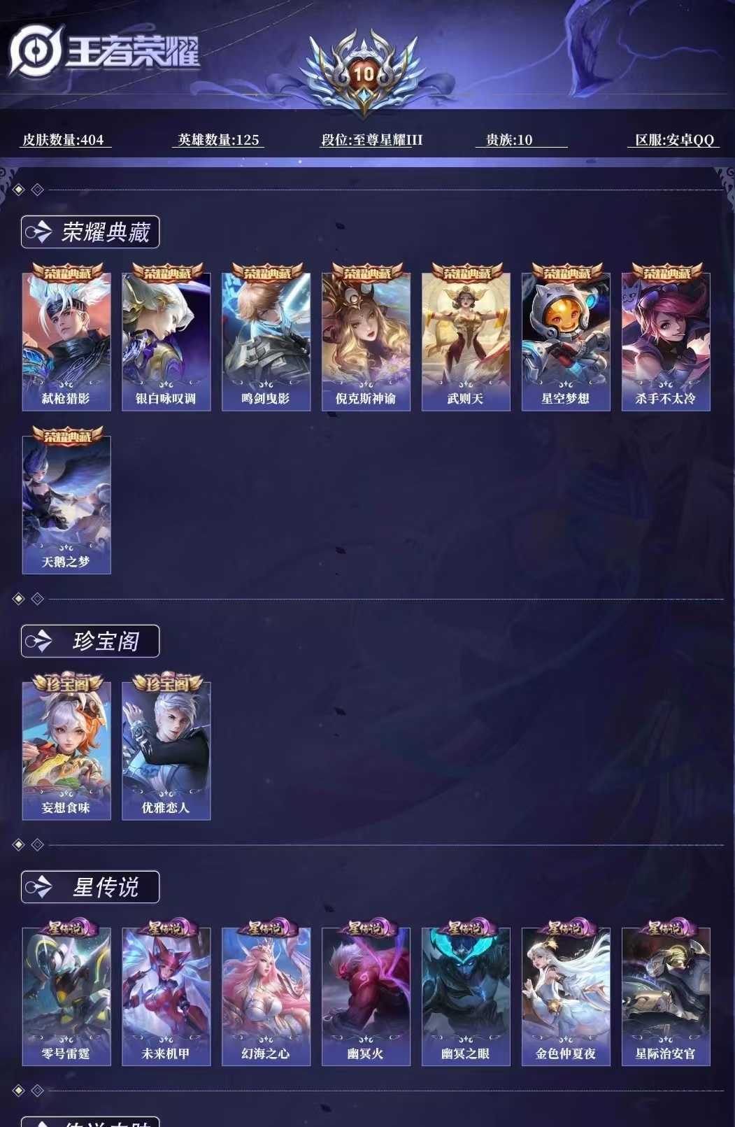 限制: 租号5次及以上 |装备描述:【C47】贵族V10~404皮8典藏52传说无双飞将,神威,瑶时之祈愿,祈雪灵祝,至尊宝,梅西,白虎志,凤求凰,山海·苍雷引,山海·炽霜斩,山海·琳琅生【荣耀典藏】:弑枪猎影,星空梦想,天鹅之梦,杀手不太冷,鸣剑·曳影,倪克斯神谕,银白咏叹调