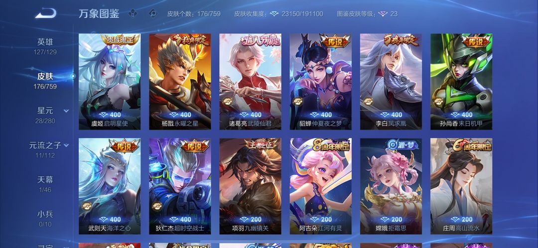 装备描述:贵族等级V8,段位至尊星耀,英雄数量124,典藏皮肤数0,皮肤数量165,至尊宝/梅西/至尊宝/梅西
