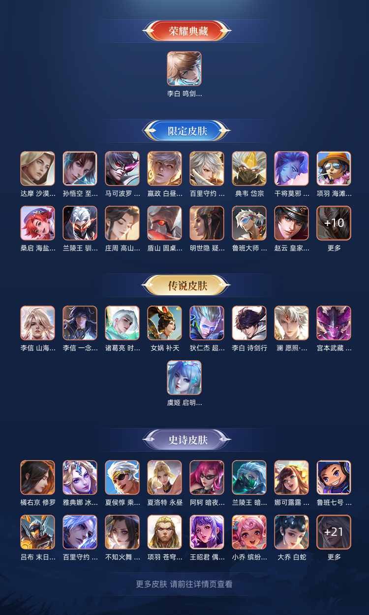 装备描述:精品V8李白荣耀典藏诗剑行曜无双云鹰火舞无双诸葛年限澜年限李信年限一念神魔女娲补天干将久胜冰霜等等73限定14传说72史诗