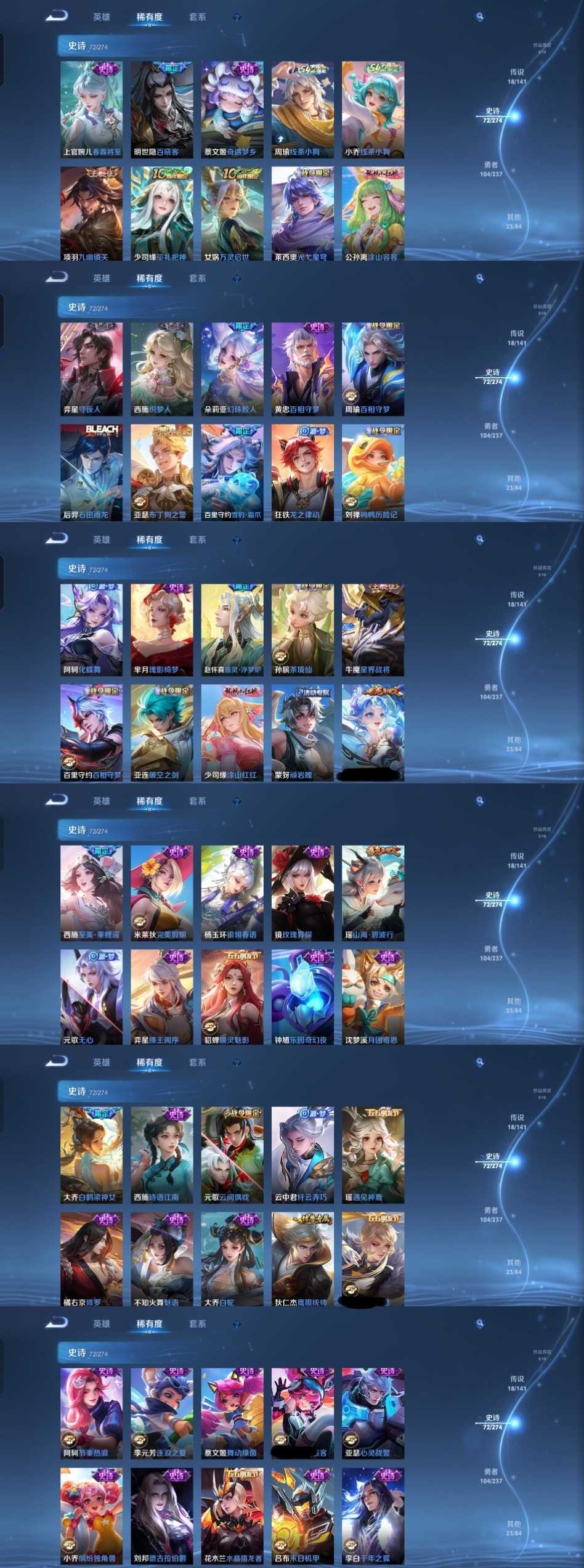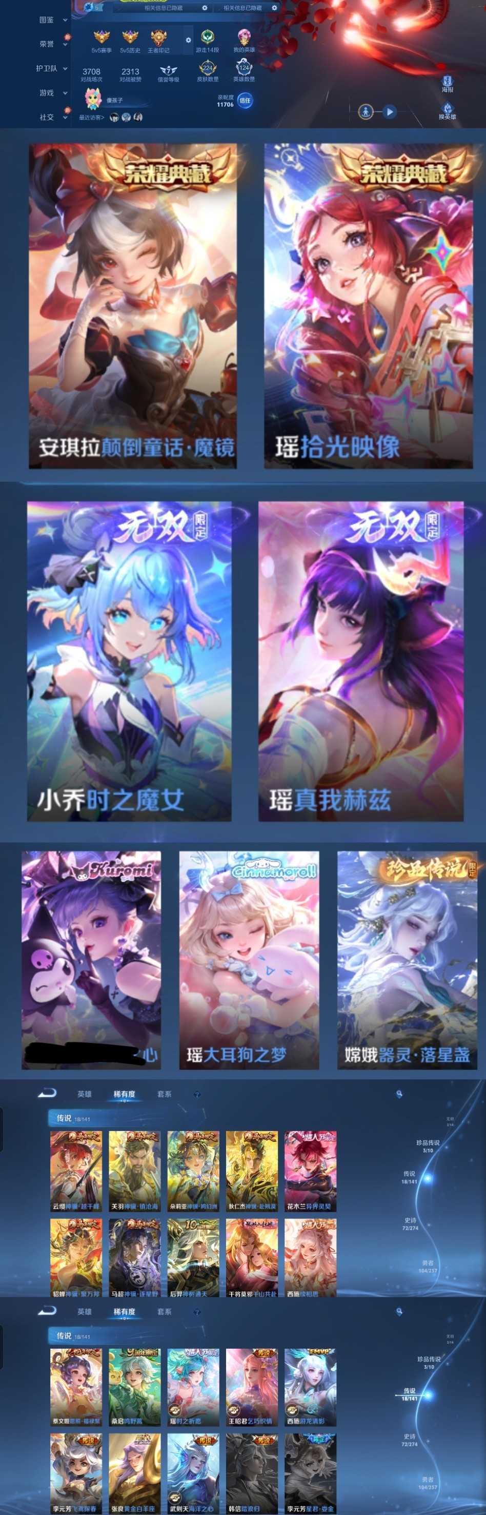 限制: 撤单率<49%才可租用此帐号装备描述:时间到了还登录白玩或者顶号全部改密拉黑处理永不解除,顶号机器会秒禁玩改密,顶号不仅拉黑还没得玩,赚三两块不容易,请理解谢谢。 ❤❤❤❤❤❤❤❤❤❤❤❤❤❤❤❤❤❤❤ 请勿开挂,挂机,送头,骂人,撤单后游戏等如有违规永久拉黑永不解除。 重置二级密码不要费劲了,号主每天都会上号查看,多行不义必自毙,人在做天在看,多做好事多自律,少做缺德事。 该号英雄124个皮肤224个,典藏2个,无双2个,珍品传说3个,传说18个,史诗72个,祝您游戏愉快~