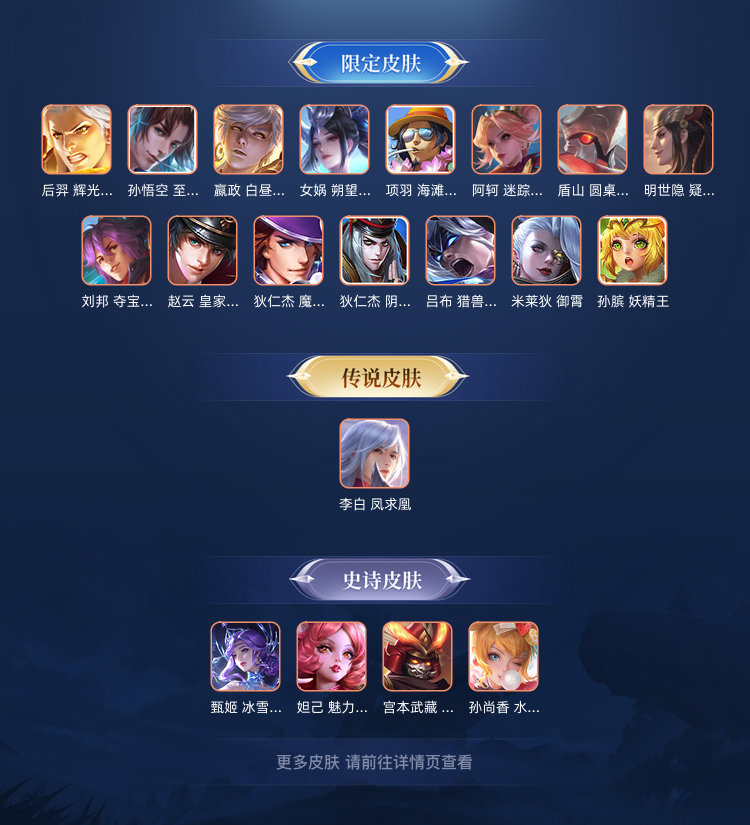 装备描述:孙悟空(孙悟空 至尊宝,区标);李白(李白 凤求凰,区标);后羿(后羿 阿尔法小队,后羿 辉光之辰);杨戬(杨戬 埃及法老);马可波罗(马可波罗 激情绿茵);虞姬(虞姬 凯尔特女王);安琪拉(安琪拉 玩偶对对碰);孙尚香(孙尚香 水果甜心);韩信(韩信 街头霸王,韩信 教廷特使);宫本武藏(宫本武藏 鬼剑武藏,宫本武藏 未来纪元,宫本武藏 霸王丸,宫本武藏 万象初新);姜子牙(姜子牙 星梦巡礼);项羽(项羽 帝国元帅,项羽 海滩派对);小乔(小乔 万圣前夜);貂蝉(貂蝉 异域舞娘);钟馗(钟馗 地府判官);瑶;夏侯惇;娜可露露;狄仁杰(狄仁杰 万华元夜,狄仁杰 鹰眼统帅,狄仁杰 魔术师,狄仁杰 阴阳师);妲己(妲己 少女阿狸);鲁班七号(鲁班七号 福禄兄弟);裴擒虎;吕布(吕布 猎兽之王);墨子;诸葛亮(诸葛亮 掌控之力,诸葛亮 星航指挥官);戈娅;兰陵王;阿轲(阿轲 迷踪丽影,阿轲 爱心护理);铠(铠 龙域领主,铠 曙光守护者);橘右京;曜;甄姬(甄姬 冰雪圆舞曲,甄姬 逆浪荇歌,甄姬 花好人间);刘备;夏洛特;公孙离(公孙离 花间舞);李元芳;莱西奥;不知火舞;元歌;典韦(典韦 穷