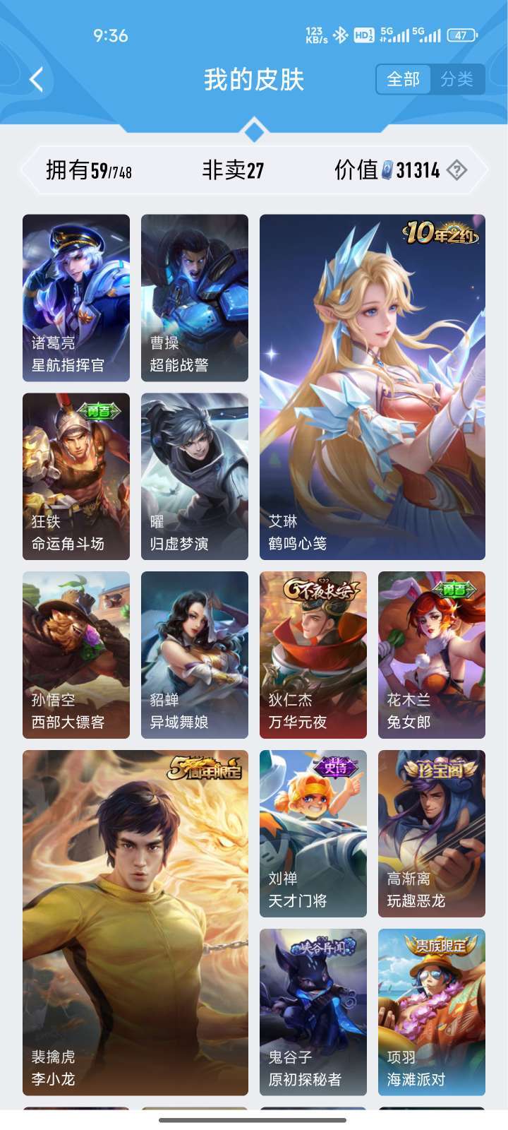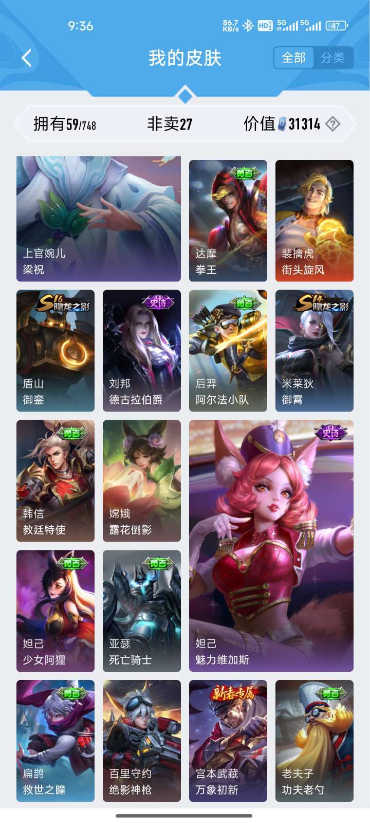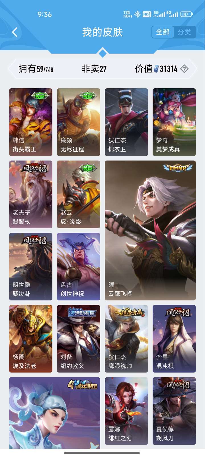 主打一个经济又实惠,可排位,皮肤质量一般,有曜的FMVP,韩信的kpl,吕布的末日机甲