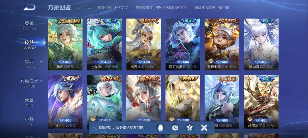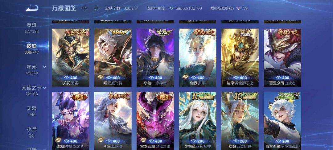 v8 368个皮肤超多限定皮肤多传说多限定史诗无双小乔,虞姬典藏,两个柯南限定至尊宝凤求凰等皮肤