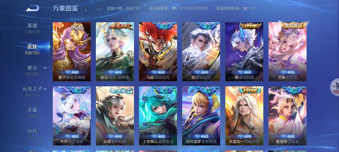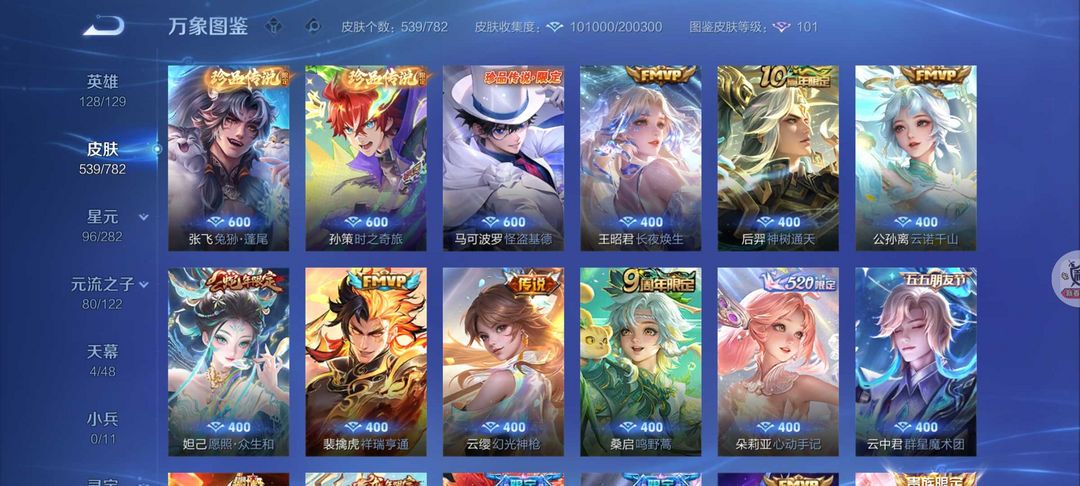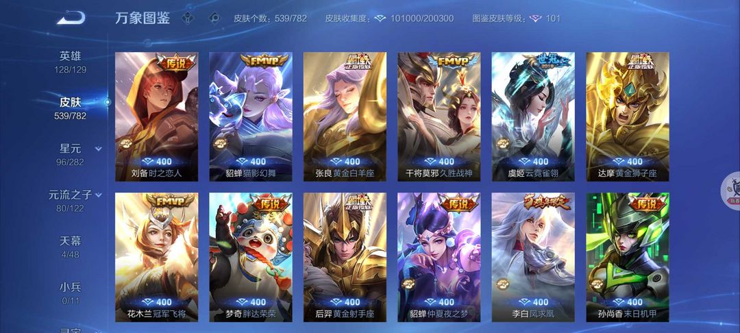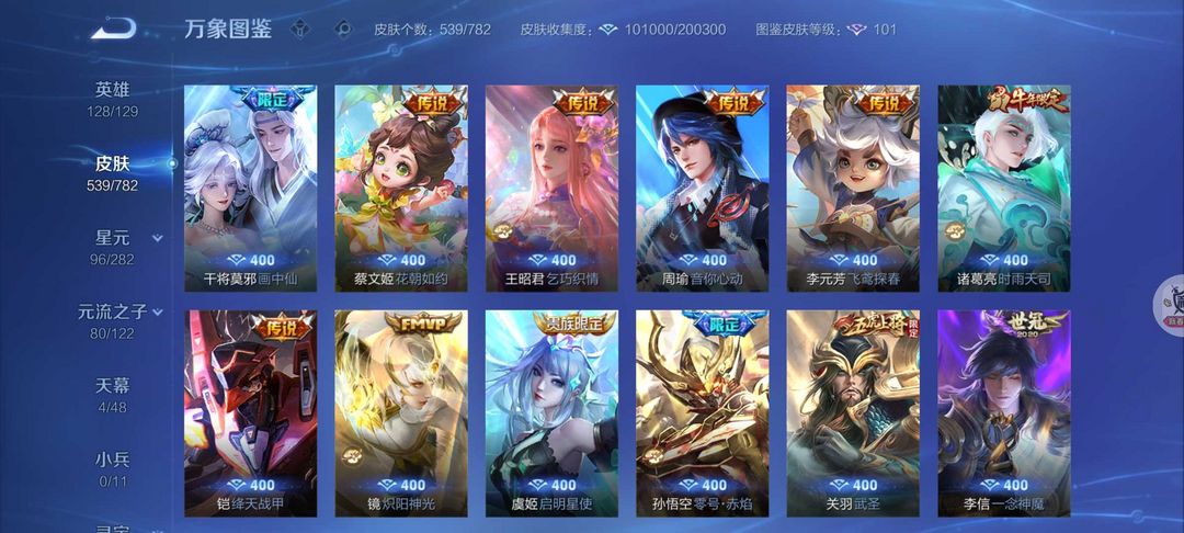 装备描述:539皮肤8典藏3无双皮❤️猴子无相无双昭君FMVP蛇年限定新皮❤️6星传说极品号❤️游走44段中路40段❤️