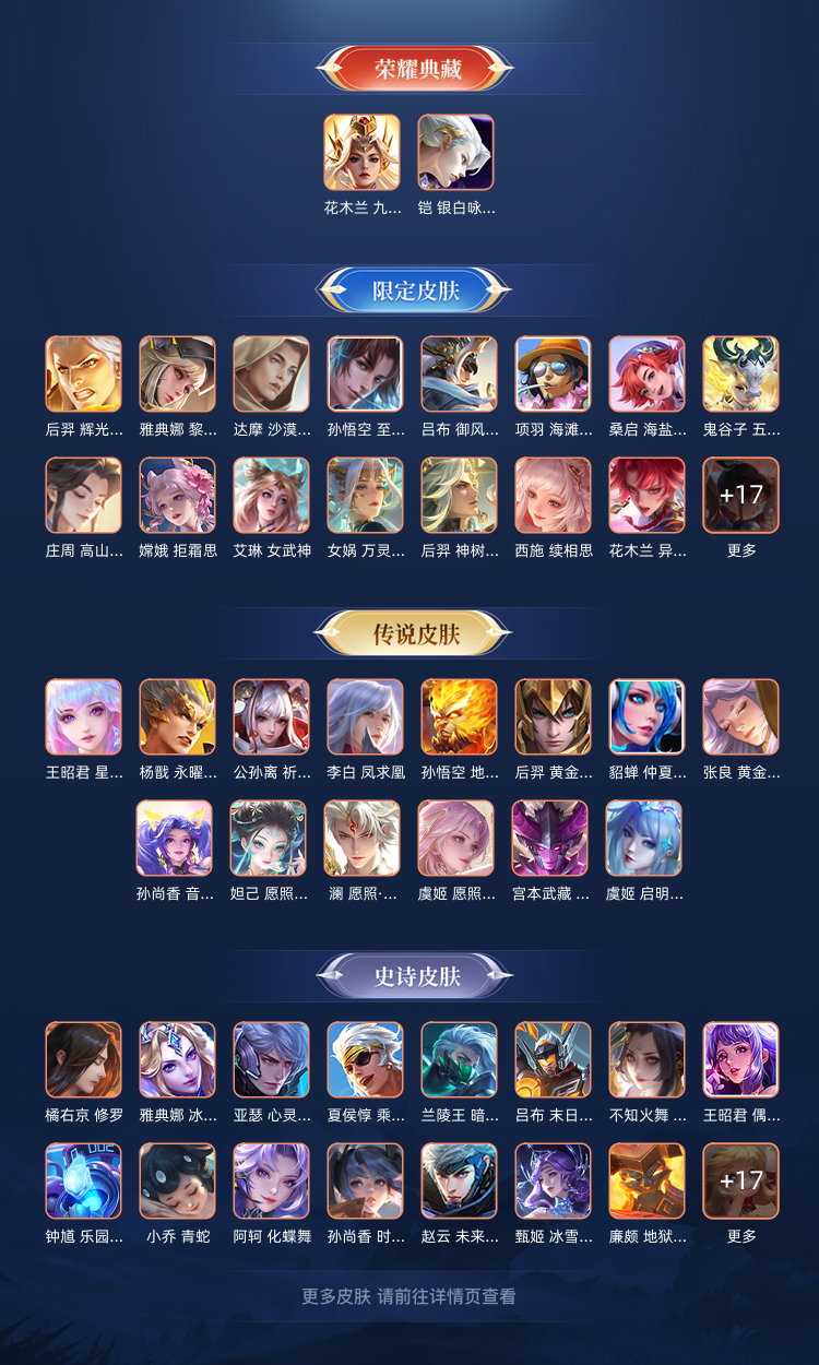 李信耀等无双共8个,加马年限定全皮,加4个珍品无双,还有诸多皮肤,请看帐号。