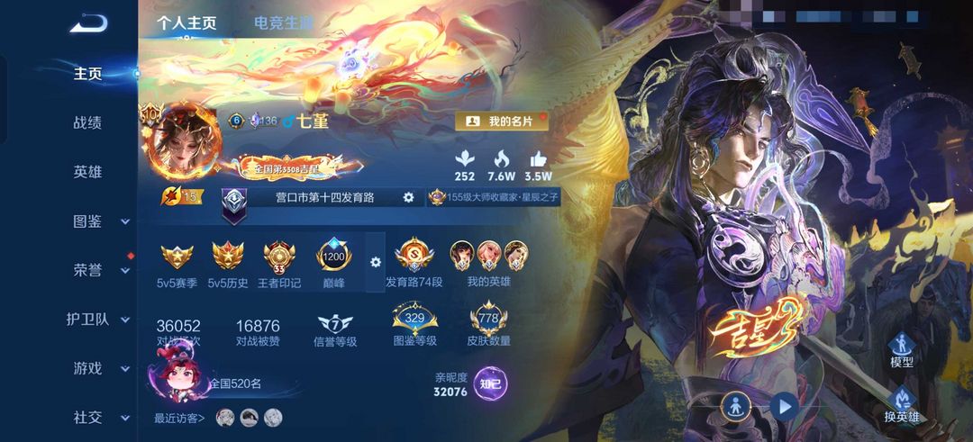 荣耀v10不禁言男号♥发育路74段♥778皮♥小国公孙离虞姬孙尚香♥图鉴329❤️马年吉星