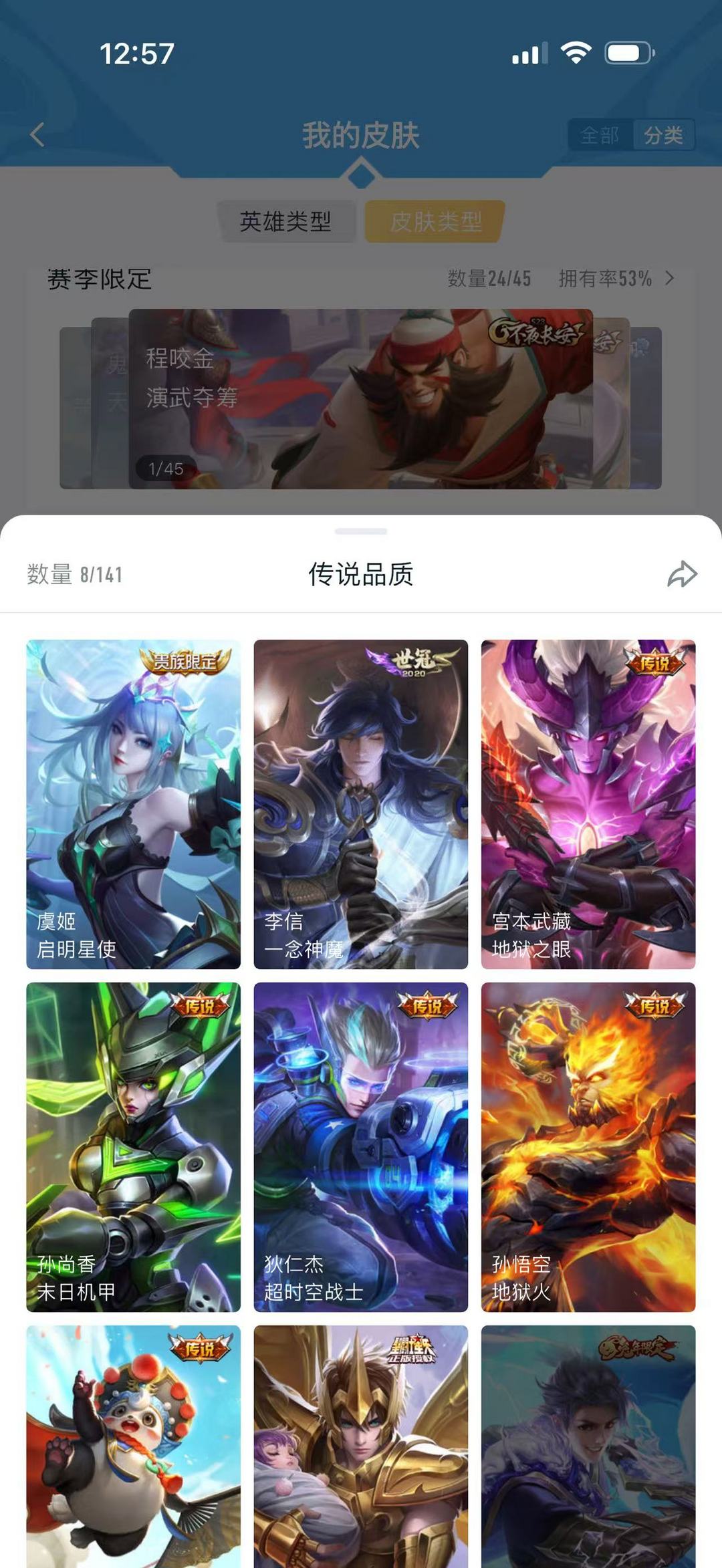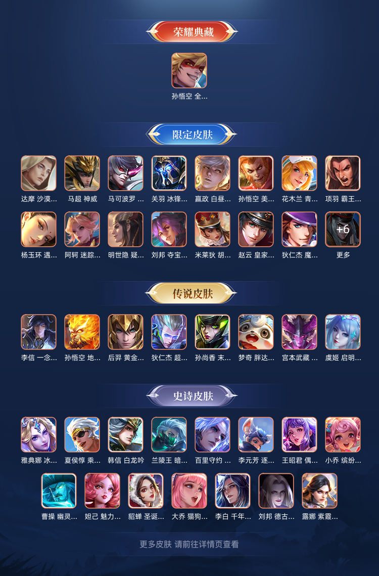 装备描述:英雄:韩信(韩信 逐梦之影,韩信 街头霸王,韩信 白龙吟,韩信 教廷特使);孙悟空(孙悟空 西部大镖客,孙悟空 全息碎影,孙悟空 地狱火,孙悟空 美猴王);孙尚香(孙尚香 末日机甲,孙尚香 沉稳之力);妲己(妲己 魅力维加斯,妲己 少女阿狸);钟馗(钟馗 地府判官,钟馗 驱傩正仪);东皇太一(东皇太一 东海龙王);不知火舞;伽罗(伽罗 箭羽风息,伽罗 花见巫女);诸葛亮(诸葛亮 星航指挥官,诸葛亮 掌控之力);马可波罗(马可波罗 暗影游猎,马可波罗 激情绿茵);大乔(大乔 伊势巫女,大乔 守护之力);小乔(小乔 万圣前夜,小乔 缤纷独角兽);镜(镜 冰刃幻境);王昭君(王昭君 精灵公主);宫本武藏(宫本武藏 地狱之眼,宫本武藏 霸王丸,宫本武藏 万象初新);马超(马超 幸存者,马超 神威);李白(李白 范海辛,李白 千年之狐,李白 敏锐之力);狄仁杰(狄仁杰 万华元夜,狄仁杰 锦衣卫,狄仁杰 魔术师,狄仁杰 鹰眼统帅,狄仁杰 超时空战士,狄仁杰 阴阳师);后羿(后羿 黄金射手座,后羿 阿尔法小队);貂蝉(貂蝉 异域舞娘,貂蝉 圣诞恋歌);关羽(关羽 天启骑士,关羽 冰锋战神,关羽 龙腾