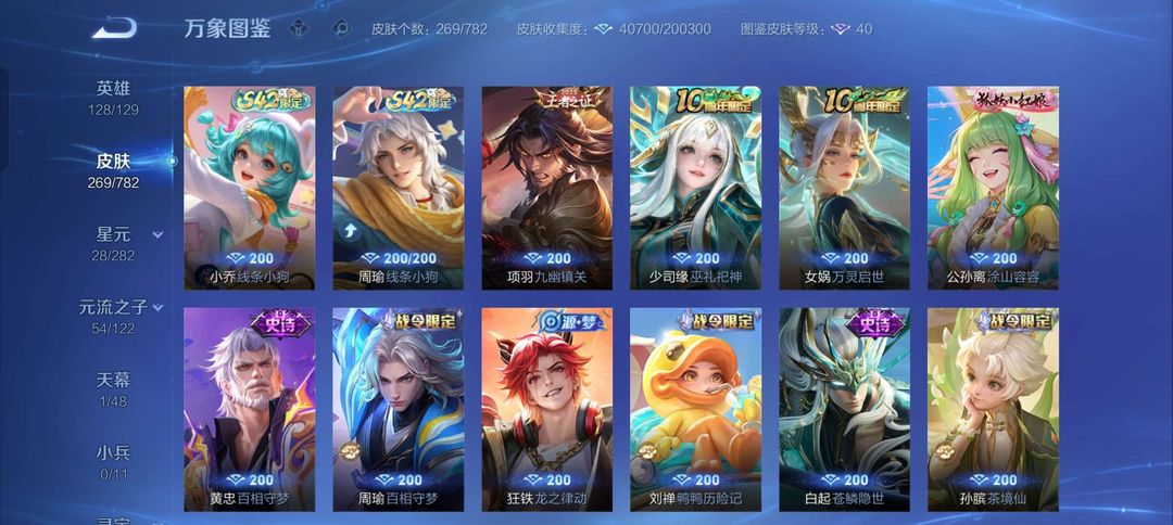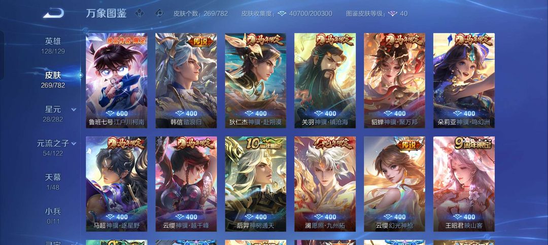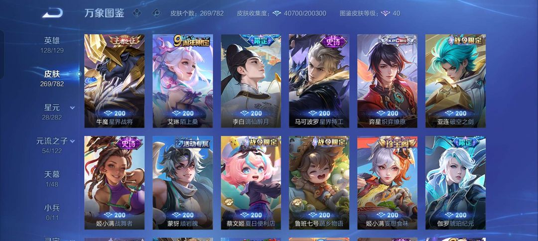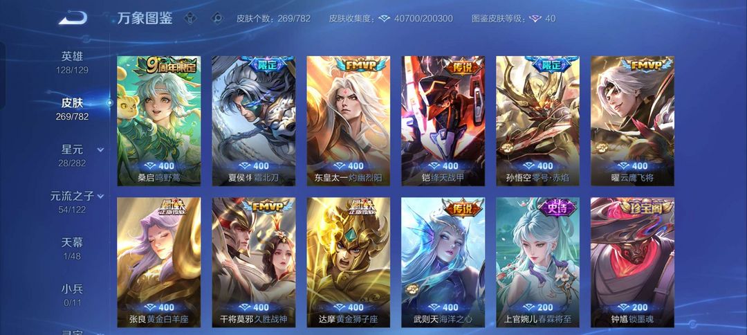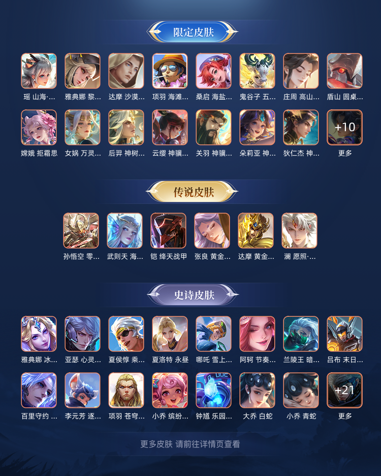 一共有271个皮肤,其中有1个珍藏传说,21个传说,91个限定,92个史诗。全英雄全铭文
