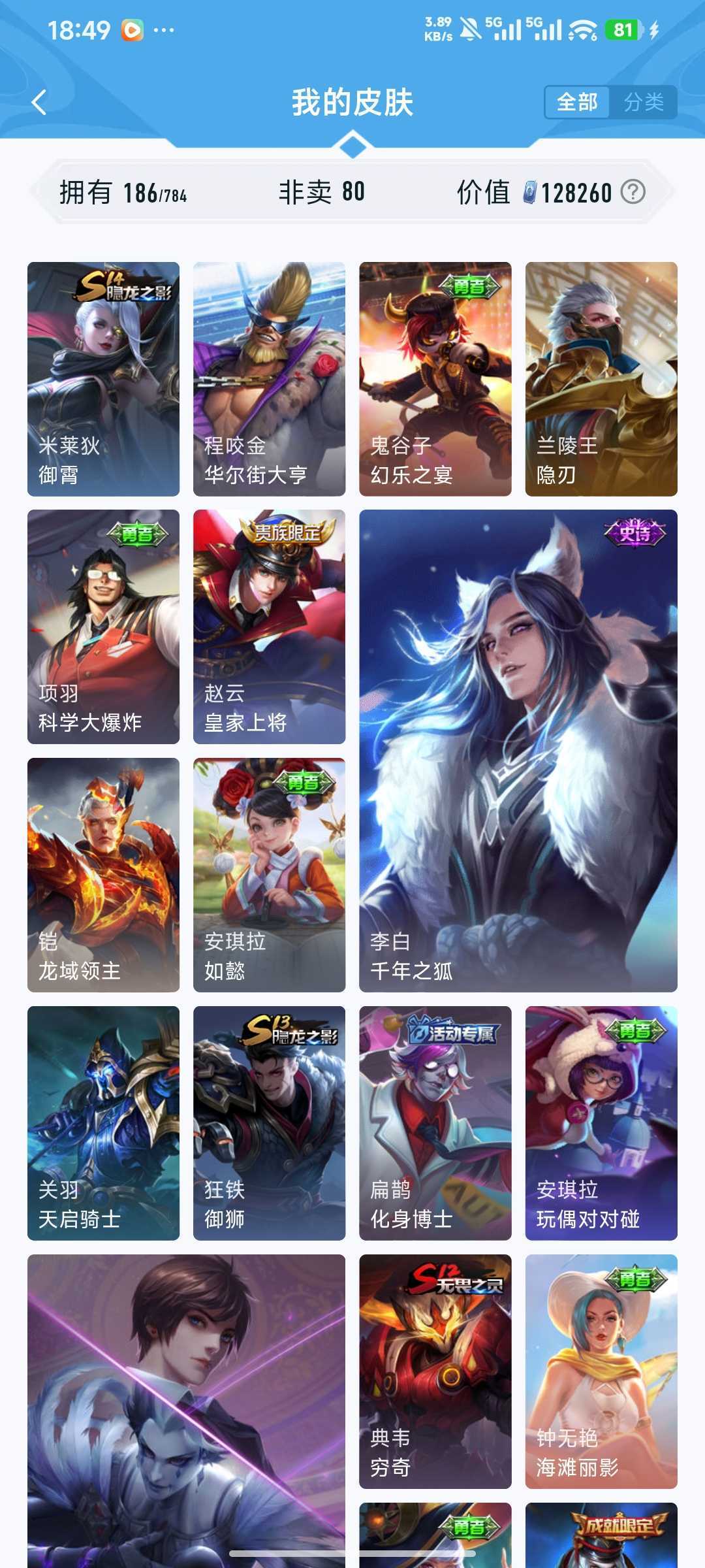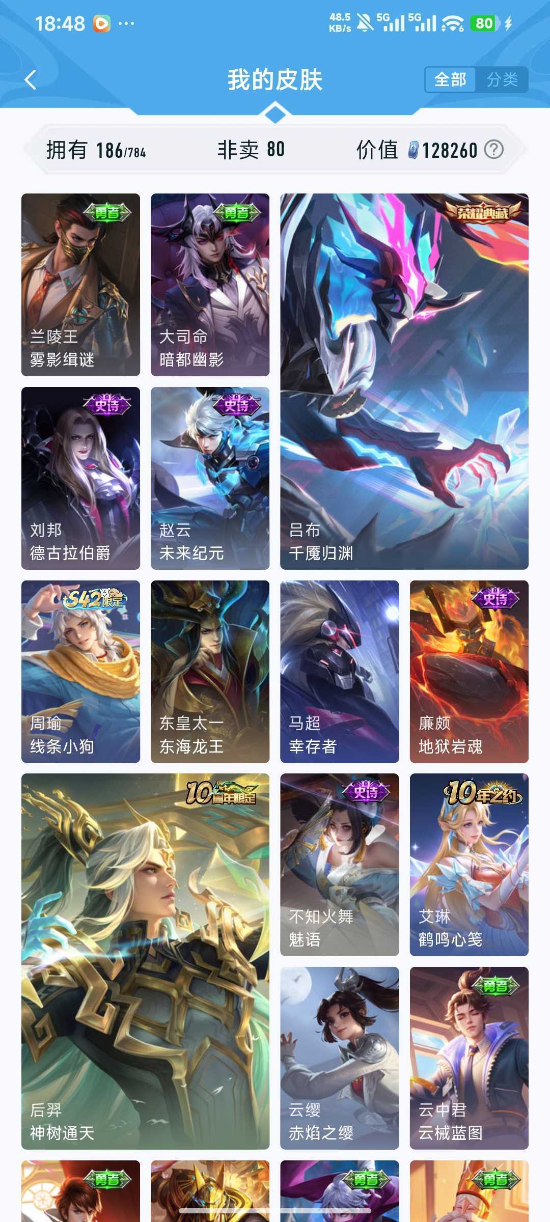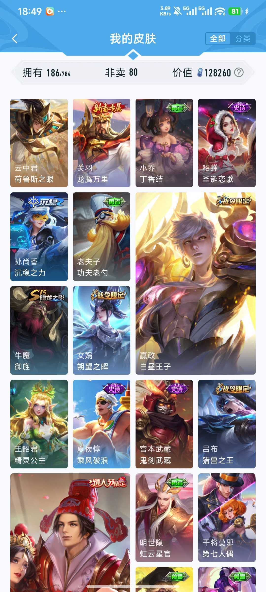 装备描述:v7 185皮 吕布典藏千魇归渊!!! 猴子星传说零号赤焰!!! 时雨天司 冰封战神 猫影幻舞 天狼狩猎者 浮梦炉
