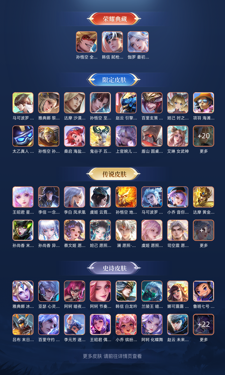 装备描述:- 无双皮肤:9/14 李信-问心剑、孙悟空-无相、铠-神罪、曜-器灵·螭龙剑、甄姬-雪境奇遇、公孙离-离恨烟、不知火舞-花合斗、小乔-时之魔女、瑶-真我赫兹 - 传说皮肤:47款 马年限定全套(云缨/关羽/朵莉亚/狄仁杰/貂蝉/马超)、蛇年限定全套(司空震/女娲/妲己/澜/蔡文姬/虞姬),含超多FMVP/世冠/情人节限定(王昭君-星穹之声、马超-无双飞将、李信-一念神魔、孙尚香-末日机甲等热门款) - 史诗100+、勇者133+ 皮肤数量拉满,英雄池全齐,对局手感拉满