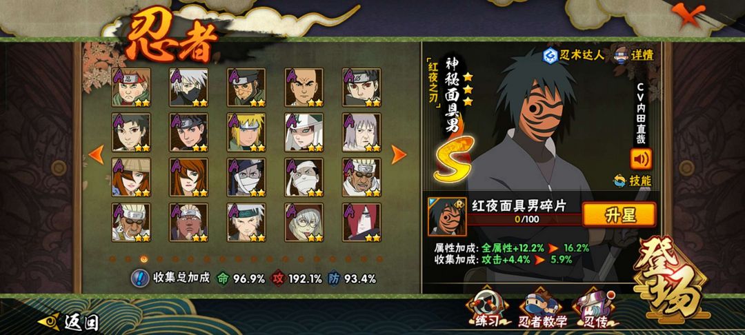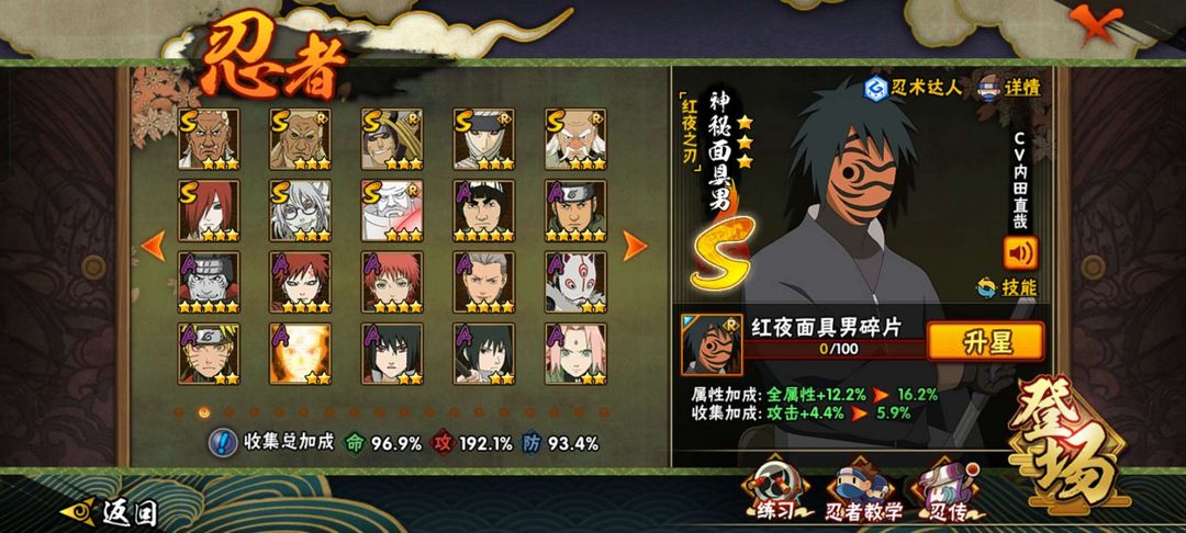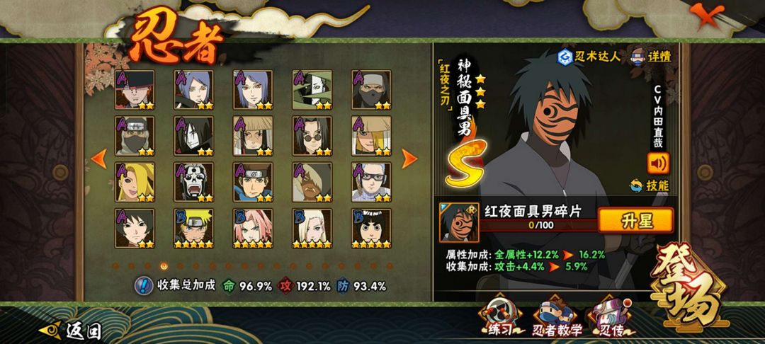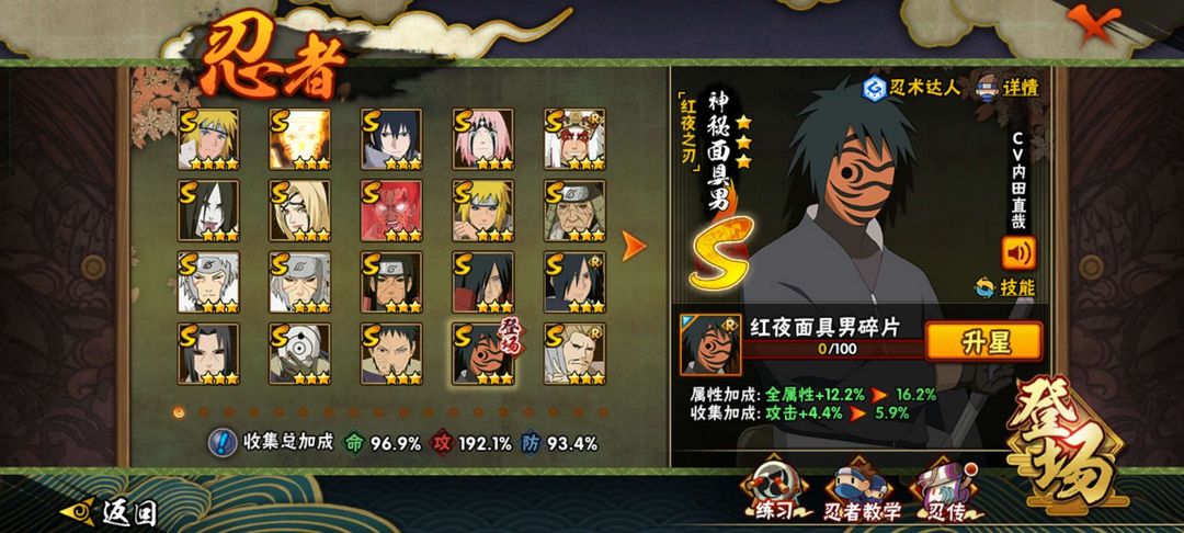 漂泊小南,紫狗,红夜带土,百战水门,忍战樱等等,147级,v12,27S,47A,有熊猫