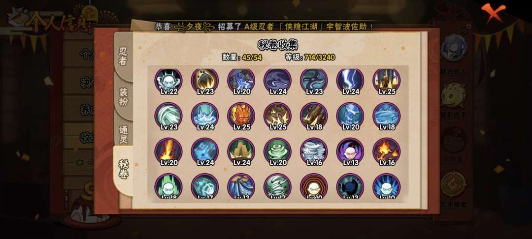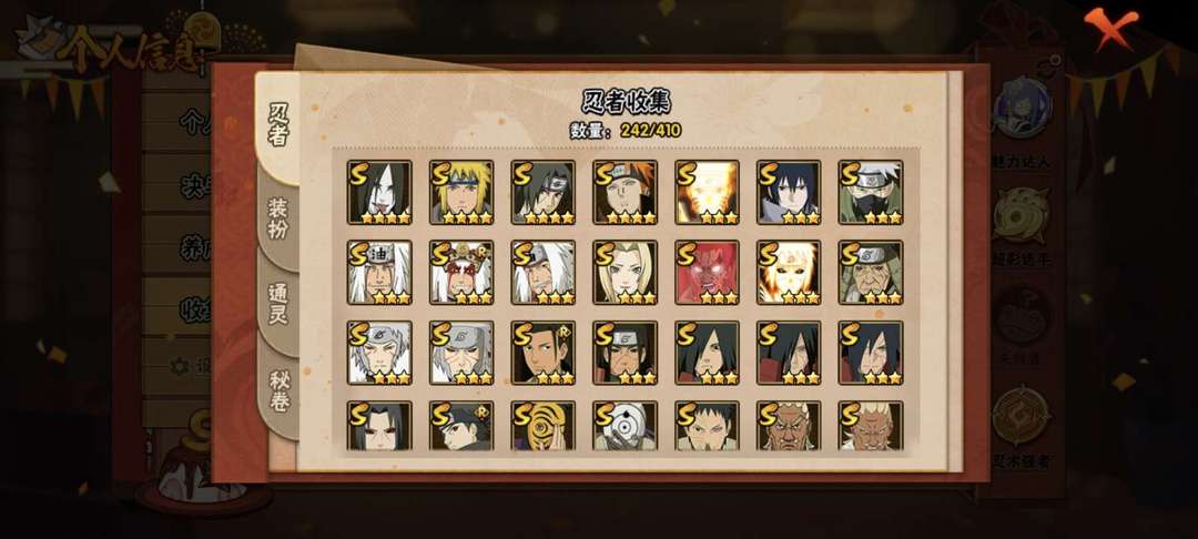 装备描述:32s金身水门已出/舍人/须佐止水/创立柱间/秽土长门/桃式/九喇嘛鸣人/万花筒佐助/死门凯/仙人兜/虎皮/仙自/解斑/百战佩恩/百战鼬/白面具/死三代/死二/扉间/长门/活斑/死斑/秽土柱间/百战水门/三代雷/断臂雷/秽土鼬/忍战带土/等44A漂泊小南,新春鼬绝大部分高招a