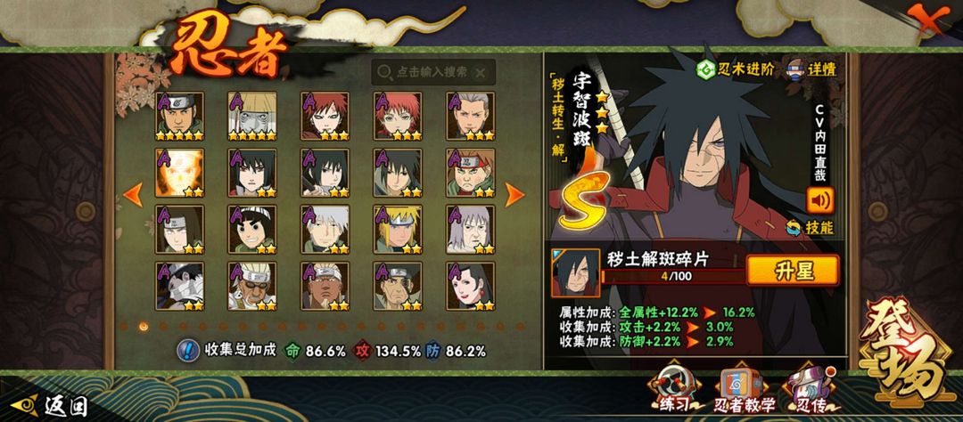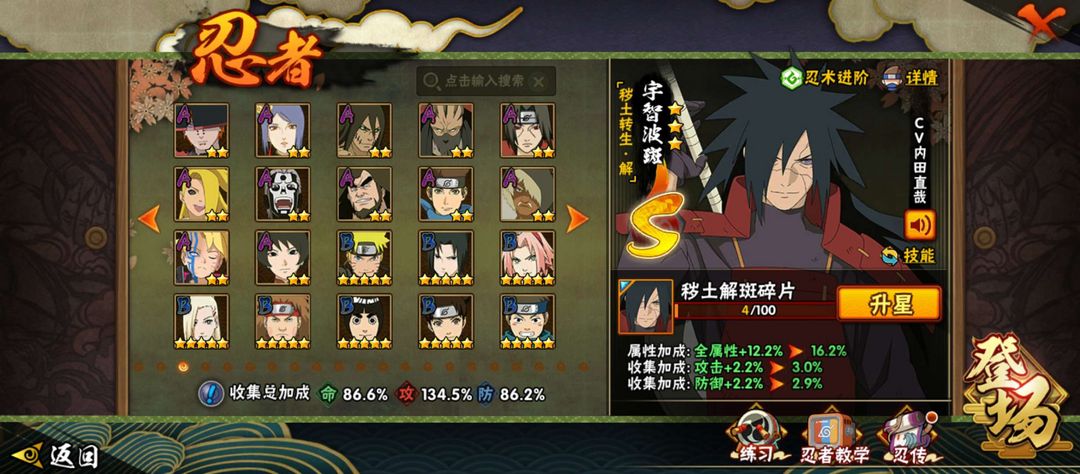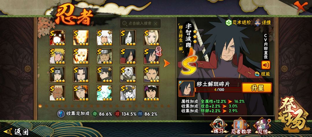 装备描述:19S 33A 金身水门,须佐止水,忍战雷,解班,盾狗,新春小南黄猿,漂泊佩恩,白面具