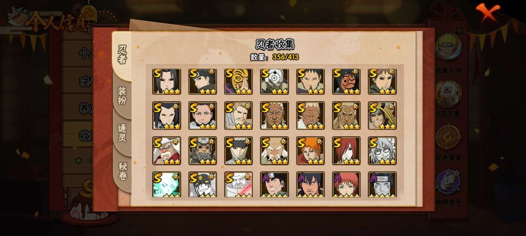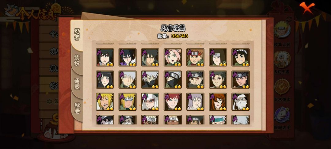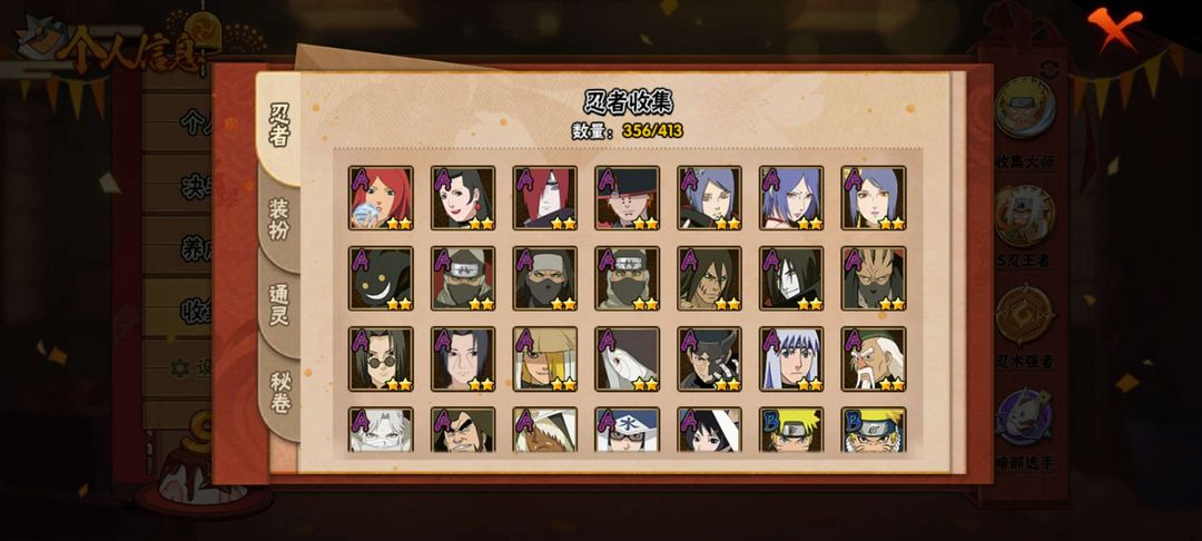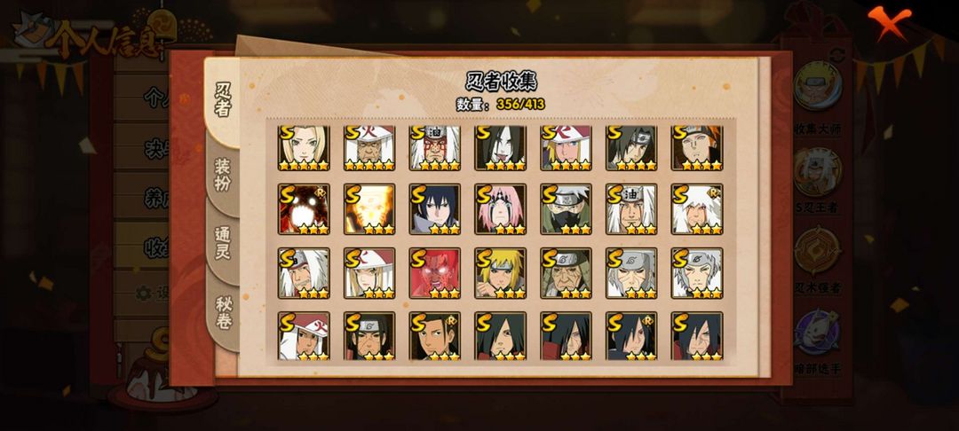 装备描述:不要老想这破二级密码,想玩的忍者大部分都有⭐侠兜,桃式,52s⭐72a⭐356忍⭐破面带土⭐解斑⭐天道超⭐黄猿⭐紫狗⭐创立柱间⭐白面具等,想玩的基本都有,随便带刷团本