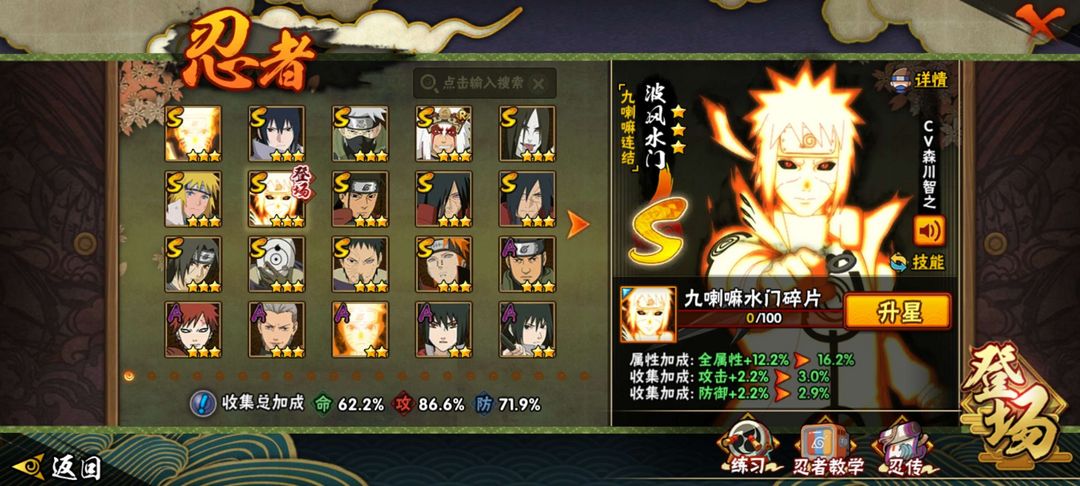 装备描述:九喇嘛水门、须佐卡卡西、破带、千手柱间、秽土斑、须佐鼬、黄猿、紫狗、川自、大蛇丸、水门、秽土解斑、金鸣、鹰佐、骨架、百豪樱、宇智波泉奈、神卡、青水、牢大、晓蛇、秽土小迪、普通人、忍战李、忍战宁次、真容卡卡西、秽土再不斩