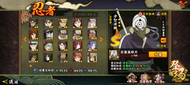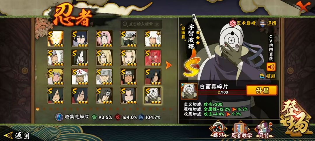 装备描述:宇智波鼬 「须佐能乎」;宇智波斑;猿飞日斩;旗木卡卡西 「须佐能乎」;“宇智波斑” 「白面具」;纲手 「百豪」;宇智波斑 「秽土转生·解」;自来也 「舞之豪杰」;宇智波鼬 「秽土转生」;春野樱 「忍界大战」;纲手;佩恩 「天道」;宇智波斑 「秽土转生」;大筒木舍人 「最终章」;迈特凯 「死门」;药师兜 「仙人模式」;半藏 「秽土转生」;千手扉间 「秽土转生」;漩涡鸣人 「九喇嘛连结」;自来也 「传说中的三忍」;宇智波佐助 「永恒万花筒」;波风水门;大蛇丸;宇智波带土 「忍界大战」;千手柱间 「秽土转生」 A忍者:宇智波佐助 「须佐能乎」;旗木卡卡西 「幻之真容」;宇智波鼬 「夏日限定」;小南 「漂泊浪客」;长十郎 「六代目水影」;长门 「青年」;照美冥 「五代目水影」;我爱罗 「疾风传」;飞段 「死司凭血」;迈特凯;桃地再不斩 「秽土转生」;李洛克 「忍界大战」;漩涡鸣人 「九尾查克拉」;奇拉比;春野樱 「百豪」;角都 「秽土转生」;千代 「近松十人卫」;宇智波止水;艾 「青年」;千手扉间 「漂泊武士」;黑土 「四代目土影」;干柿鬼鲛;达鲁伊 「五代目雷影」;猿飞阿斯玛 「秽土转生」;