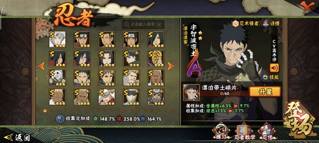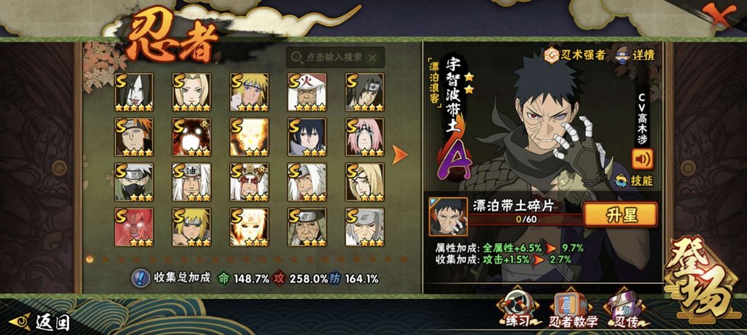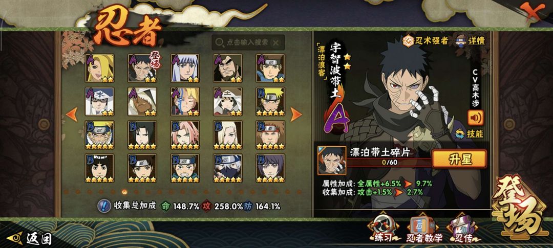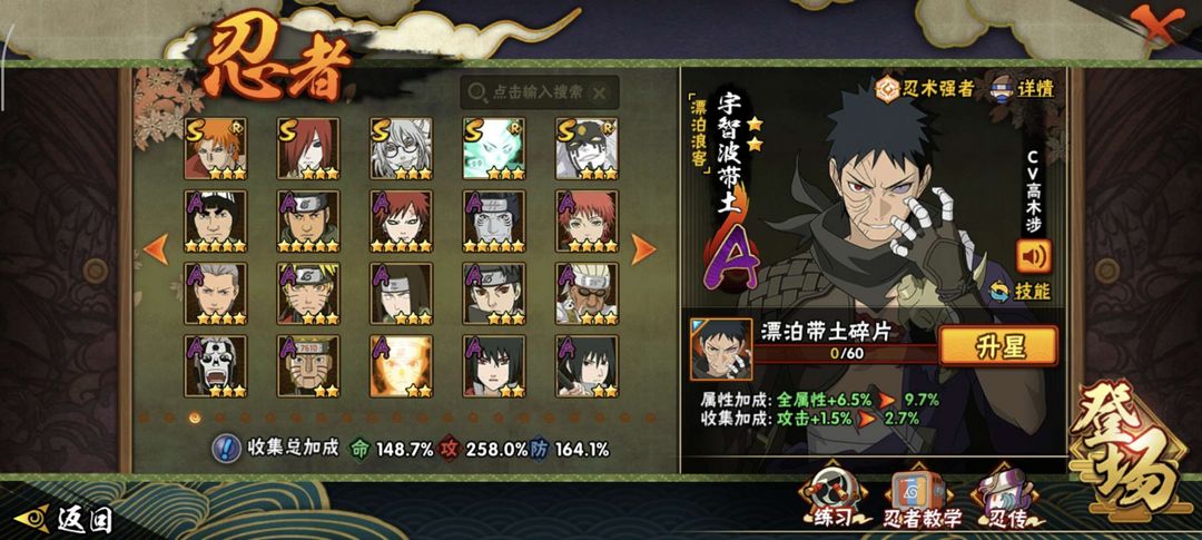 侠隐佐助,侠隐大野木45个s,64个a高招全都有,有漂泊佩恩,漂泊带土,漂泊小南,新春鼬,忍法帖