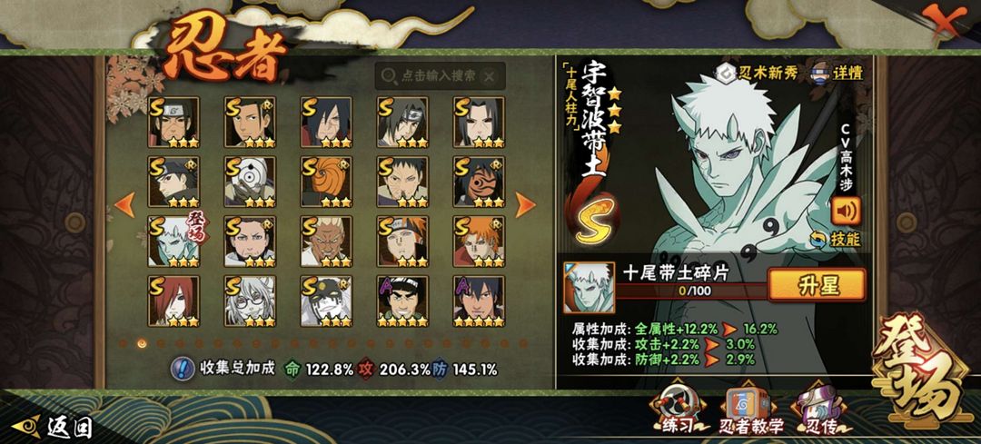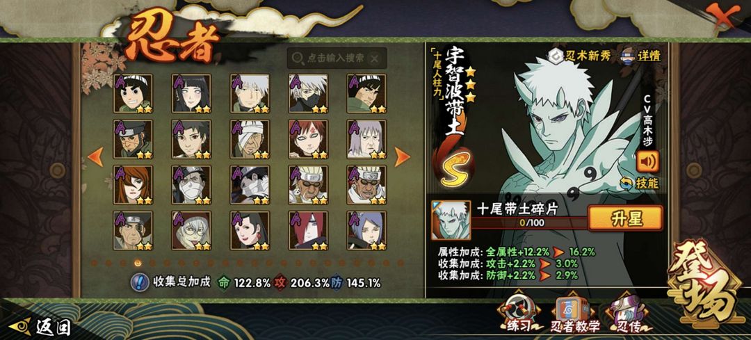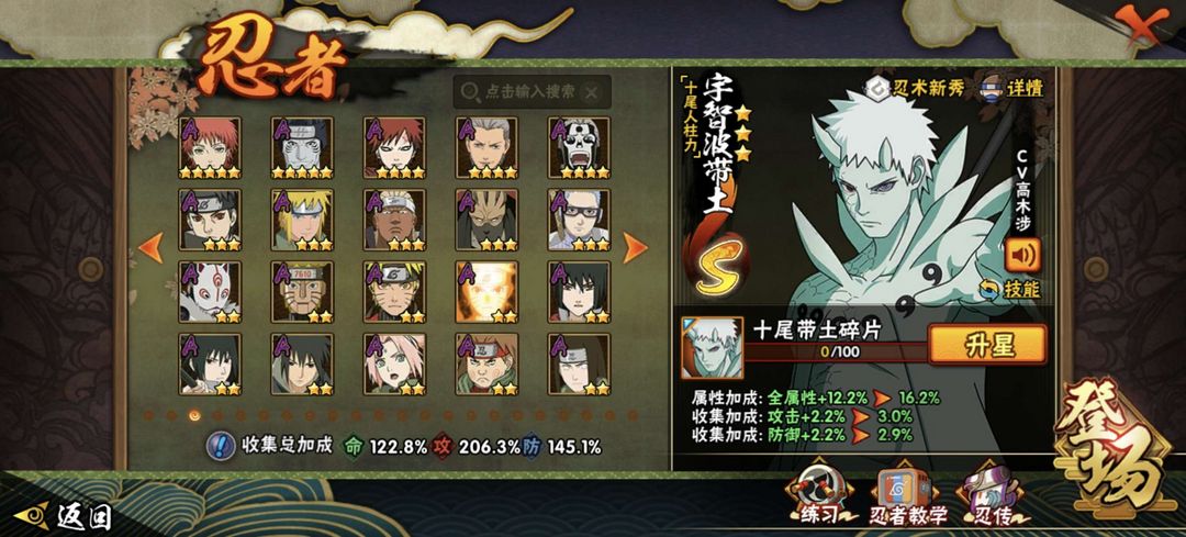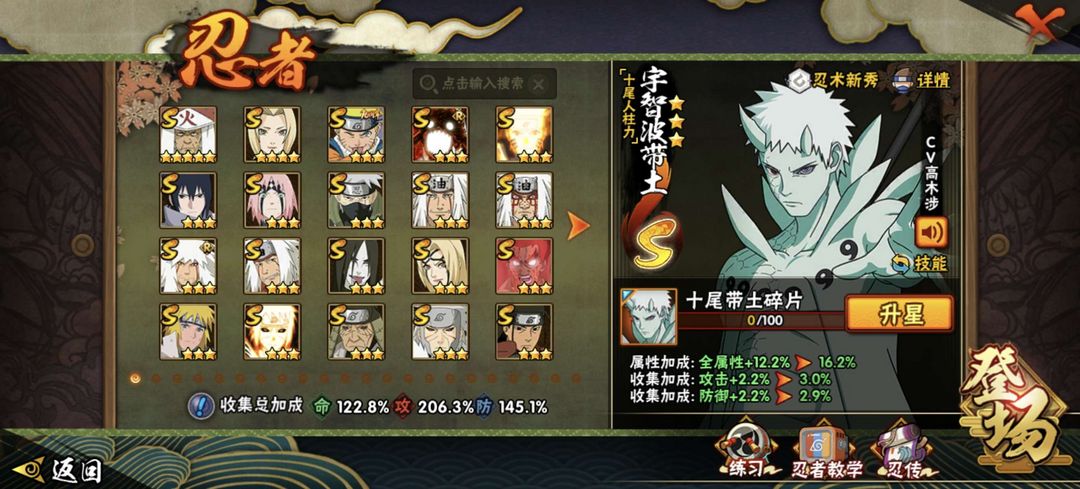 装备描述:全高招A 39S 全组织皮肤 1875W战力 六道带土 白面具 六尾鸣人