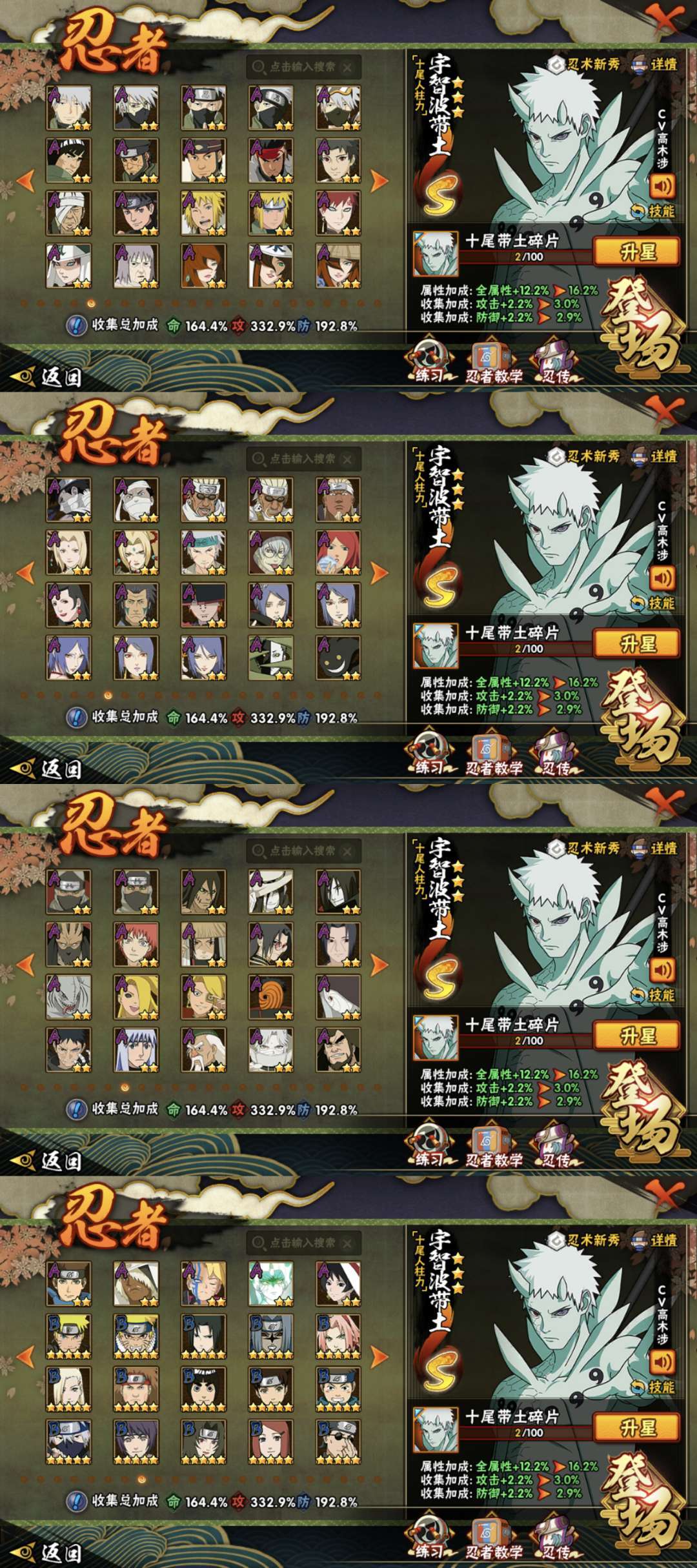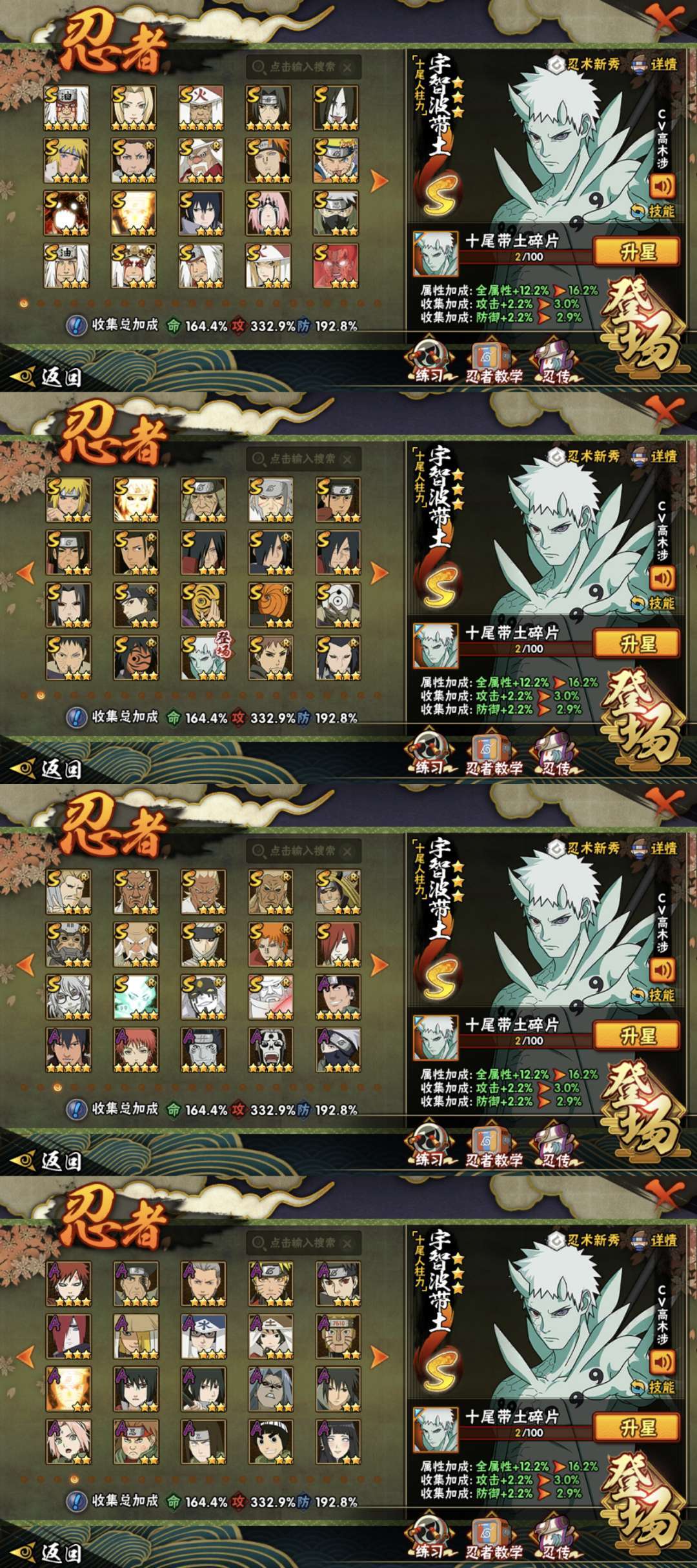 装备描述:S忍只差神驹班、宇智波斑、千手扉间,点卷A大部分都有。水/土属攻2200+,可带团本。150换套装二基本5分钟左右