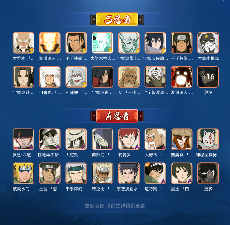 33S⭐61A⭐漂泊带土⭐黑绝⭐新春小南⭐漂泊扉间⭐侠兜⭐侠佐助⭐主流氪金忍者基本都有