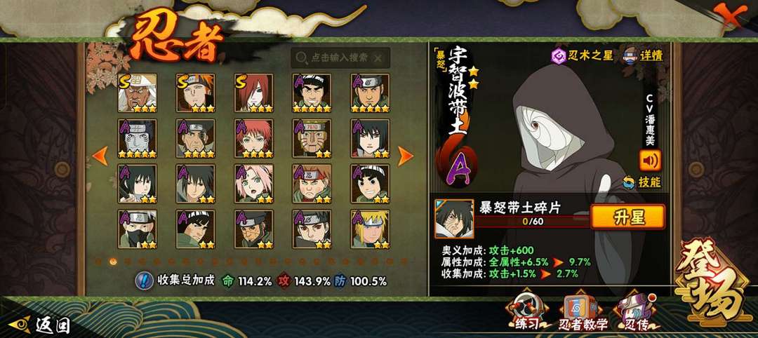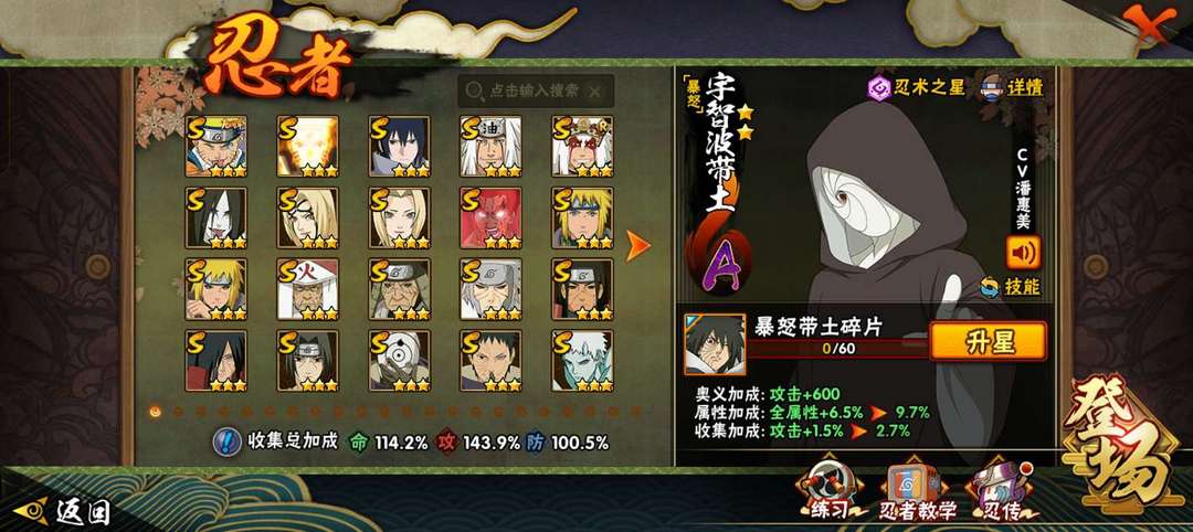 装备描述:十尾带土,木叶四强,永恒佐,九尾鸣人,暴怒带土,漂泊二代,死门凯,一万五百万战力,打白面具团本轻轻松松。