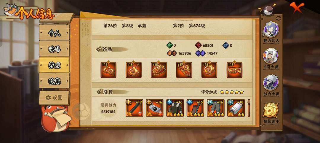 可打排位,可打团本,强势忍者,好玩忍者多,秘卷等级高,有十尾带土。