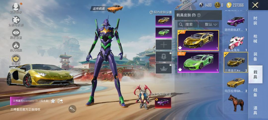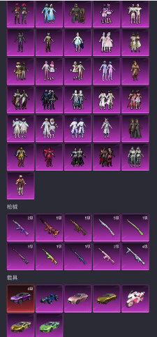 36粉装10特效枪7载具/小丑.紫螳螂.暗影哥特.木乃伊.满级路特斯/双金兰博