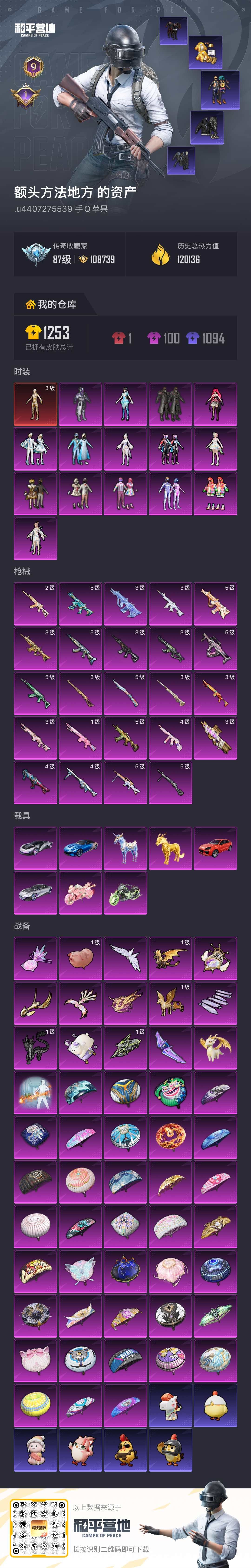 限制: 租号3次及以上 | 撤单率<50%才可租用此帐号装备描述:1红装-15粉-24枪-8载具 3级图卡盟 雪国 都市寒蝎金鞋 暗影哥特 巧克力 深海小丑鱼 新101 萌熊背包 3级星梦奇缘AUG 3级沙丘之主P90 3级盛世惊鸿MK 3级金蛇镇世SCAR 3级幽焰骑士AK 3级女娲灵识M4 3级墨龙九天M4 3级圣域龙灵98K 水晶马