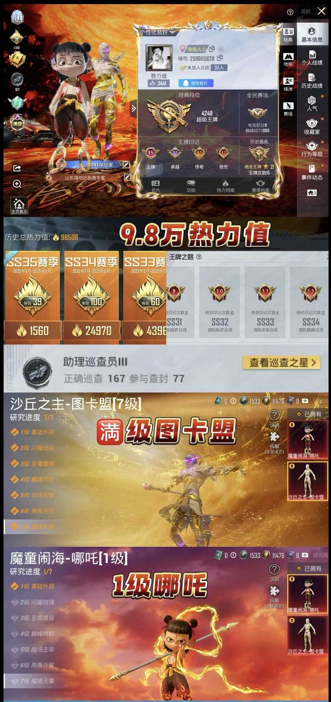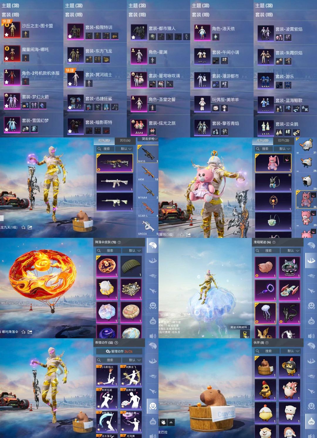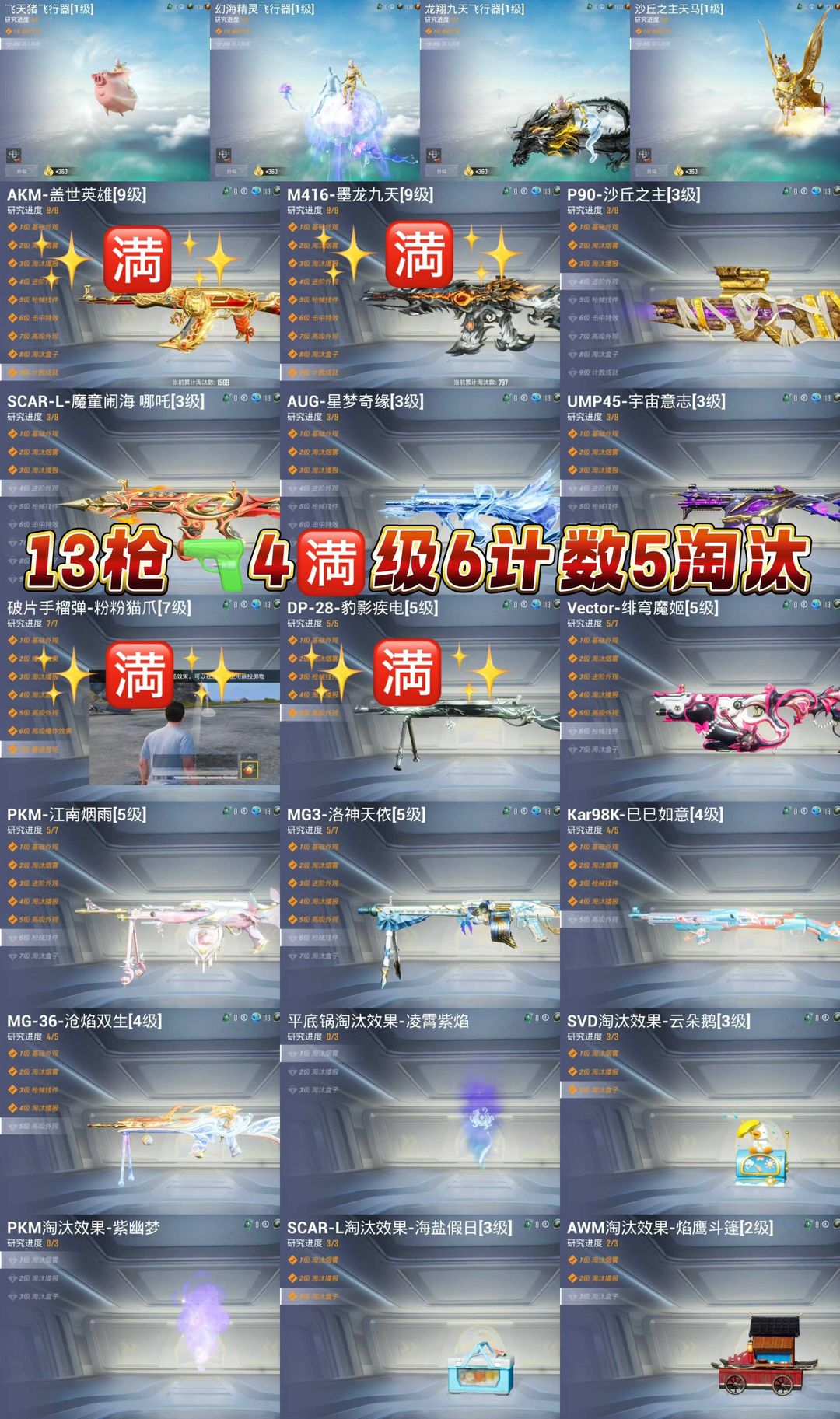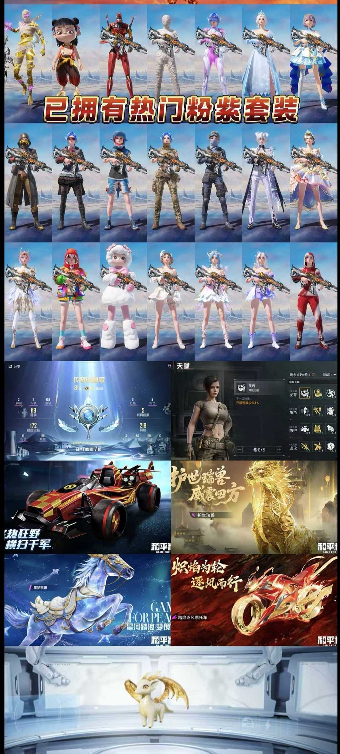 装备描述:11粉,4载具,119套装,满级木乃伊,15王牌印记,绝世王牌21星历史最高段,Vector-绯穹魔姬/AKM-盖世英雄/AUG-星梦奇缘/M416-墨龙九天/SCAR-L-魔童闹海 哪吒/MG3-洛神天依/PKM-江南烟雨/MG-36-沧焰双生/DP-28-豹影疾电/UMP45-宇宙意志/P90-沙丘之主/破片手榴弹-粉粉猫爪/Kar98K-巳巳如意/合金龙骨(红)/护世瑞兽/星梦玉骢/踏焰逐风摩托车/