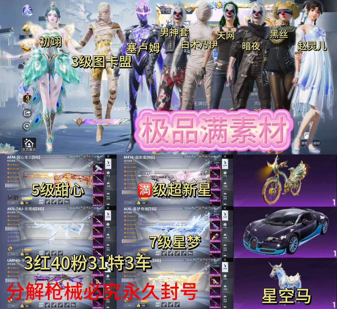 限制: 租号10次及以上 |装备描述:aq 3级图卡盟 赛卢姆 初翊 7级星梦 9级超新星 5级甜心 雪国小丑男神套 白木乃伊赵灵儿天网黑丝暗夜螳螂