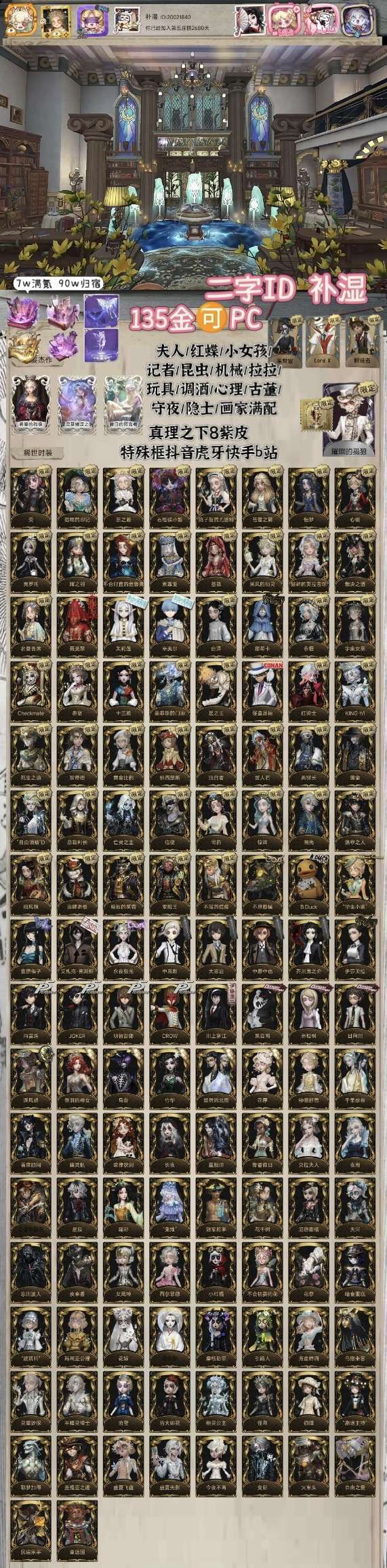装备描述:ID:补湿135金皮180稀世可pC红墨水十次共享90w+全归宿1特殊框抖音框 真相1黯/麒麟/绯/加特/白/锁芯/孤狼 夫人/红蝶/小女孩/拉拉!玩具/记者/昆虫1机械满配
